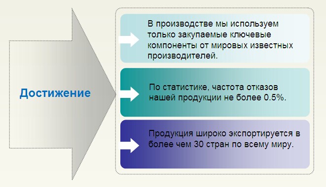 Наша компания в настоящее время расширяет рынок России и СНГ, и мы занимаемся розничными и оптовыми продажами. В изготовлении мы используем ключевые компоненты закупаемые от мировых известных производителей (фото прислано для справки). Благодаря разумной цене, высокому качеству и преовсходному обслуживанию, наша продукция уже успешно экспортируется в более чем 30 стран по всему миру.