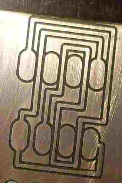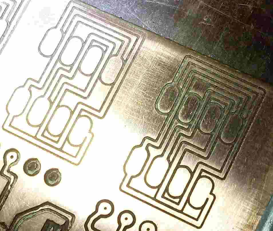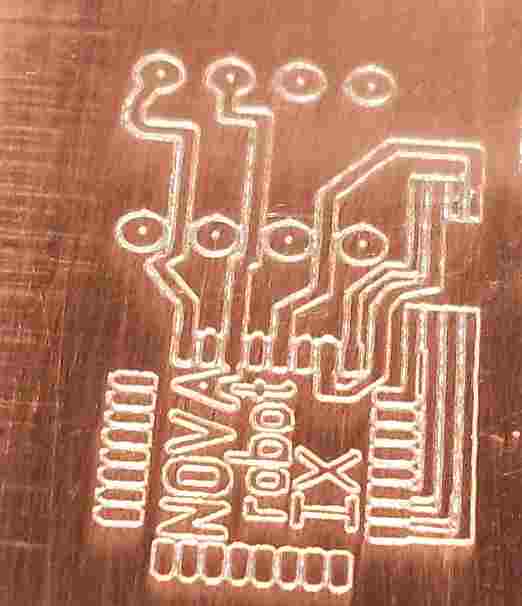 для того чтобы знать какая поверхность отсканировал её но корректор не включил. по скану максимальная неровность(горб) 0.06мм. и как раз в этом месте(слева вверху между контактными площадками) наблюдается значительное сужение дорожки - фреза забурилась. а в другом месте(правый край платы) слижком узкий прорез - фреза не достала. в том варианте что слева всё как-то более равномерно, толщина прорезов и дорожек примерно одинаковая. хотя надо тестить ещё, слева как раз попался более менее ровный кусок платы.