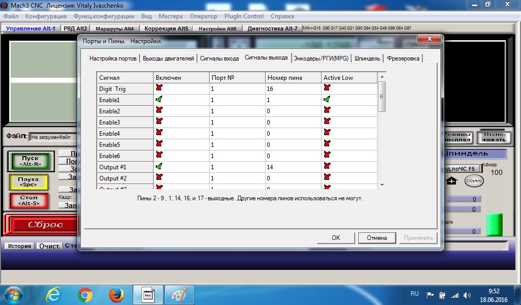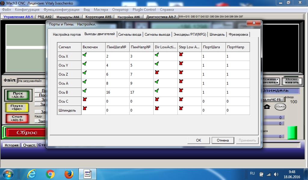 1) Производители платы как то её обновляли и после обновления изменились настройки пинов, я столкнулся с двумя платами (старой и обновлённой) и пришлось разбираться с инструкциями. На сайте Vitkovets CNC какое то время продавали уже обновлённые платы, а инструкцию прилагали старую, что вводило в заблуждение пользователей. Вы приложили инструкцию с сайта Vitkovets CNC, и как будто бы всё правильно, но бегло просмотрев я увидел отличия от той инструкции по которой настраивал я.