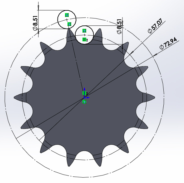 Как насчитал я на фотографии зубьев там у звездочки 14, вот и сообразил чертеж.