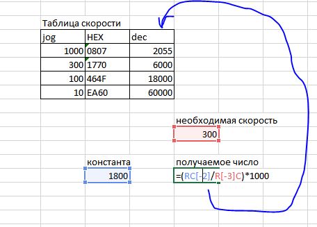 Если нужно например выполнять движение при котором JOG = 300, я вычисляю следующим образом беру константу 1800 делю на JOG и умножаю на 1000, т.е. (1800/300)*1000 = 6000 (в 16-ти ричной 1770) что и посылаю в контроллер.