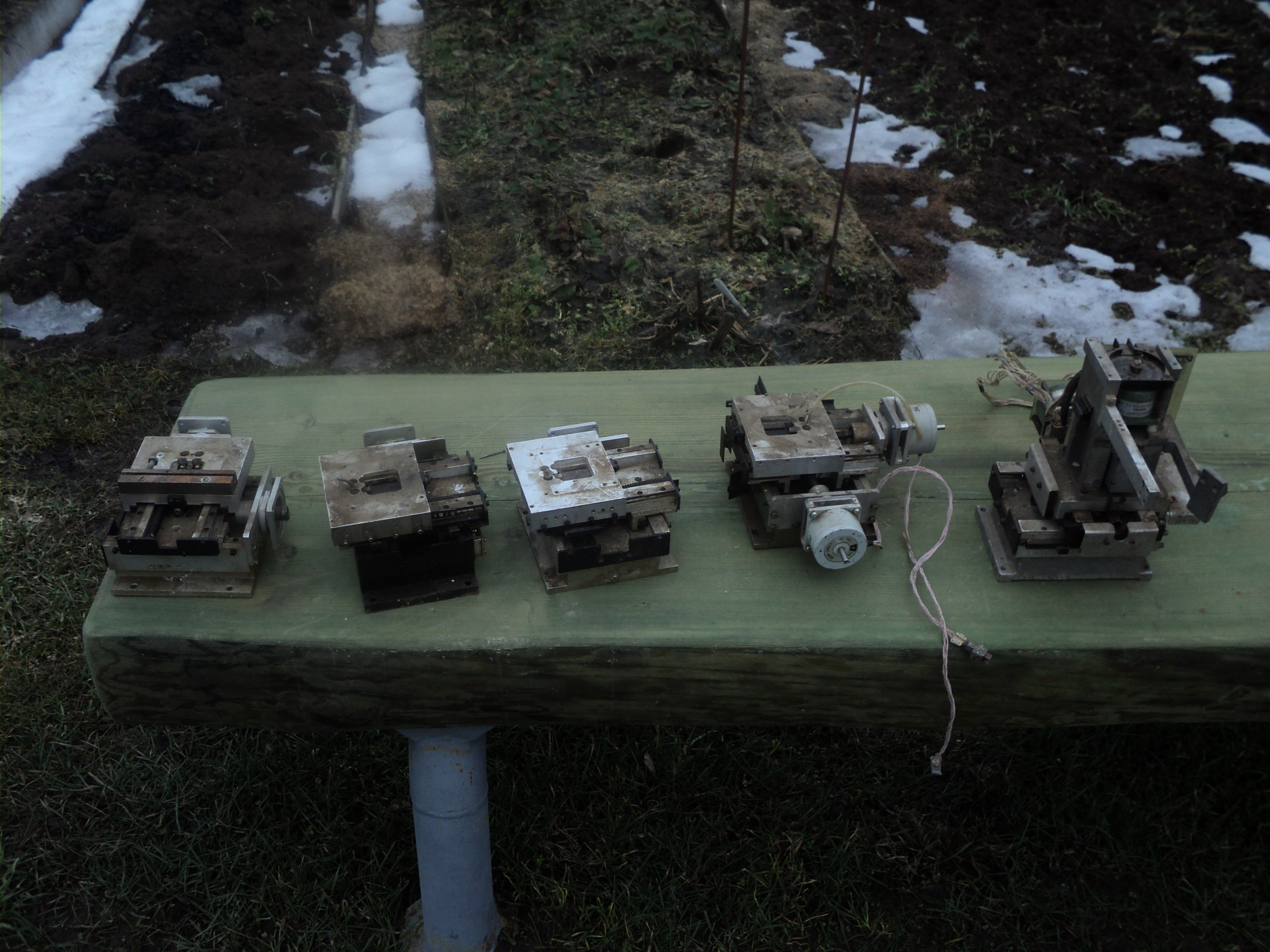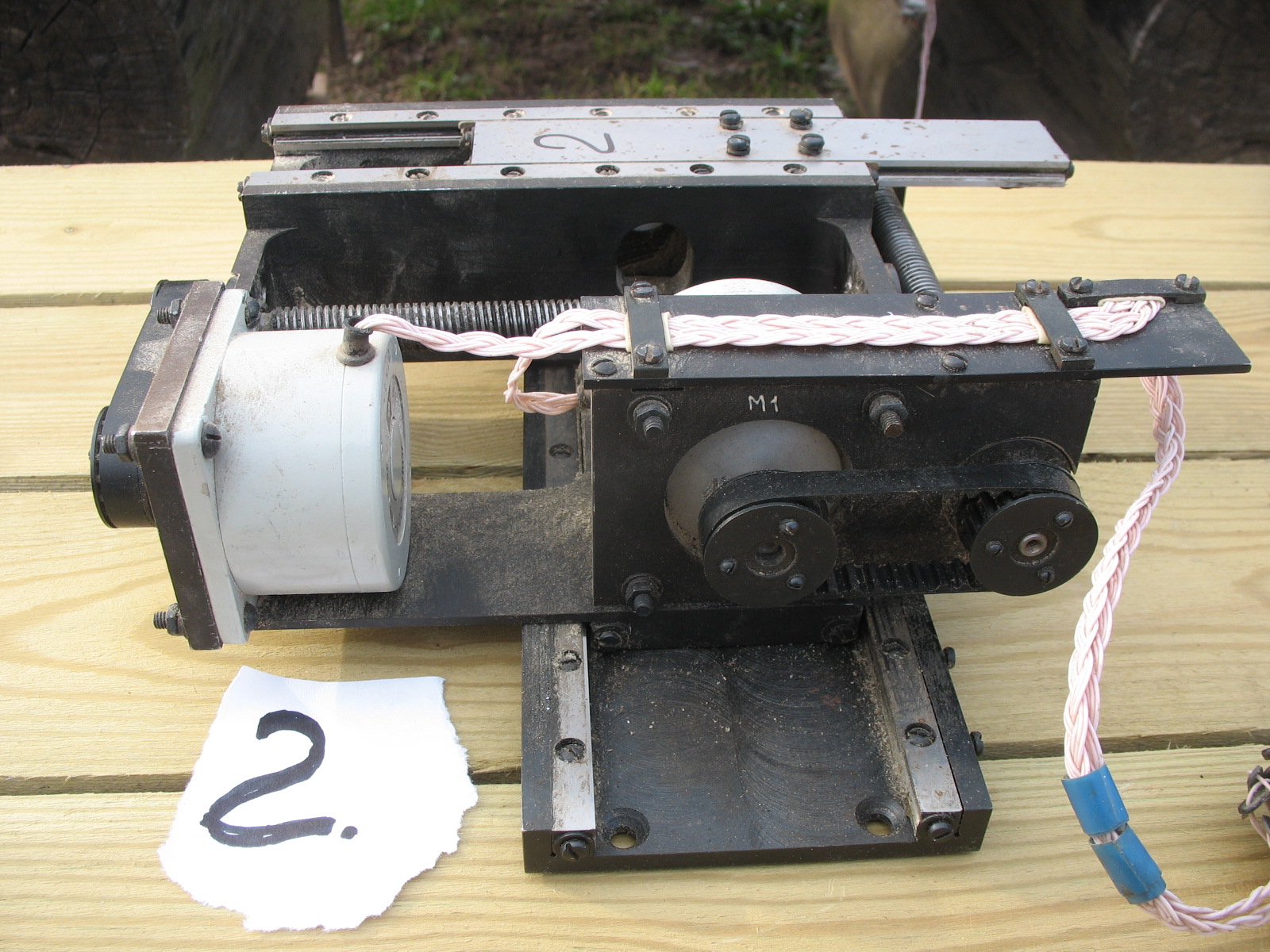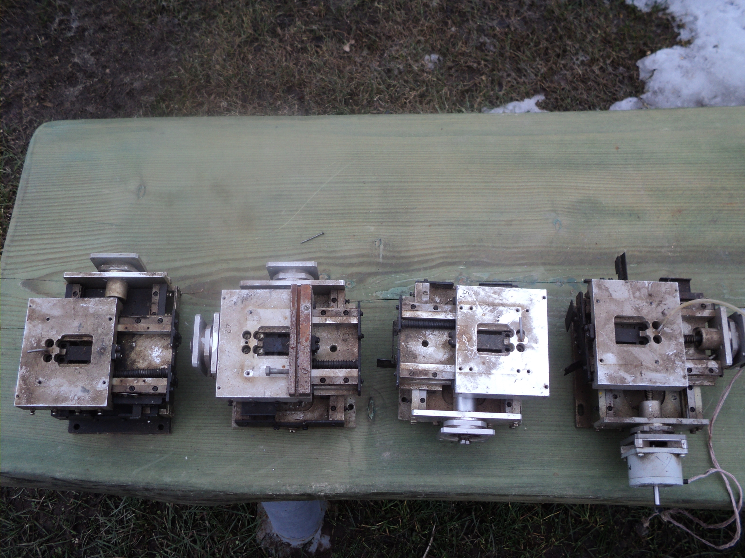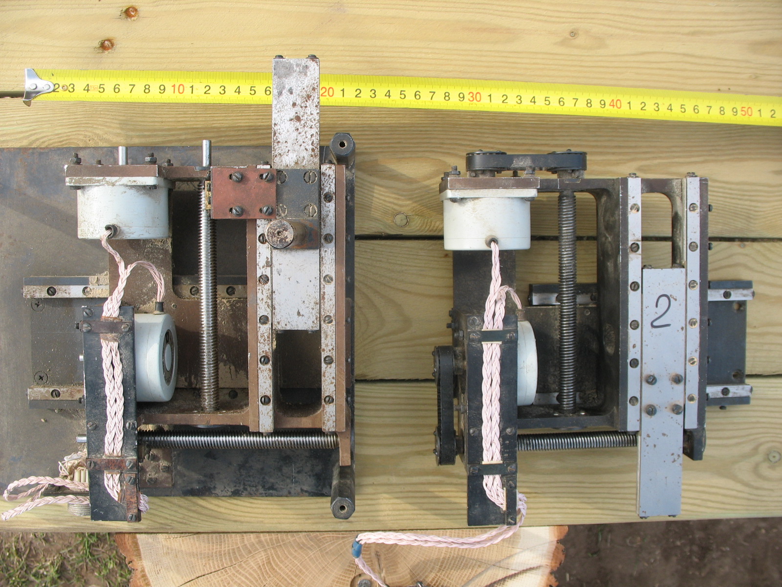 №1 на стальной пластине, отсутствуют шкивы и приводные ремешки, №2 без пластины и без гаек (гайки вроде отдельно где-то лежат) шкивы с ремешками присутствуют. На совместном фото оси загнаны в крайние положения.