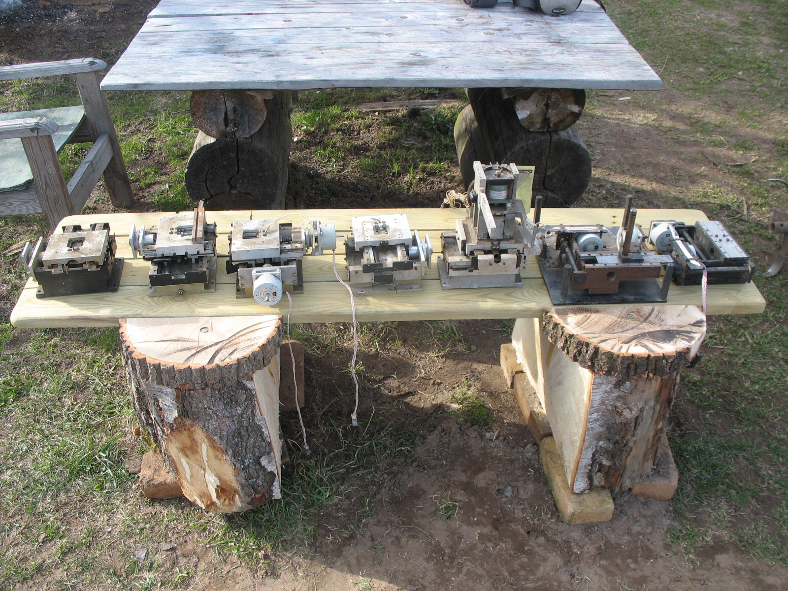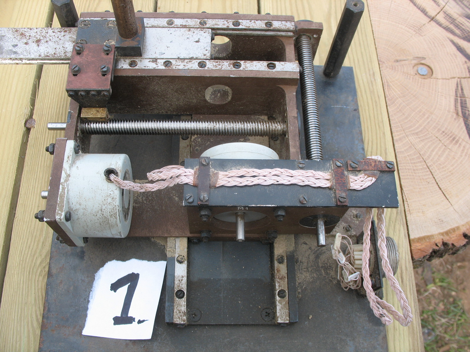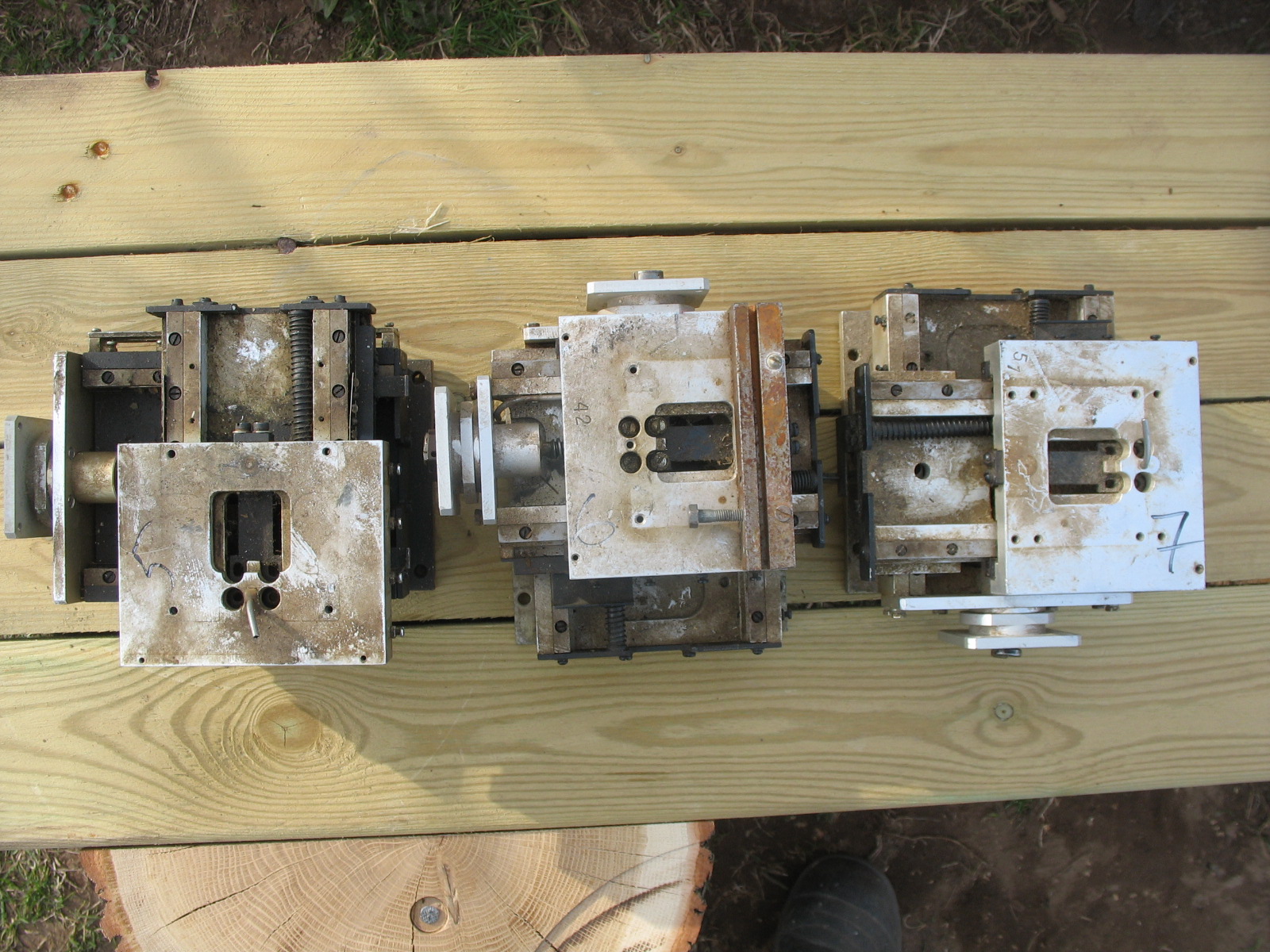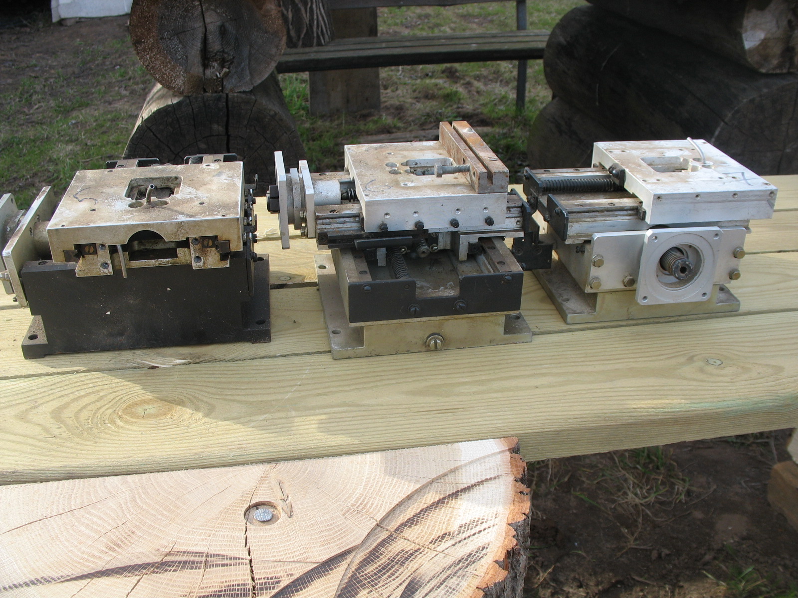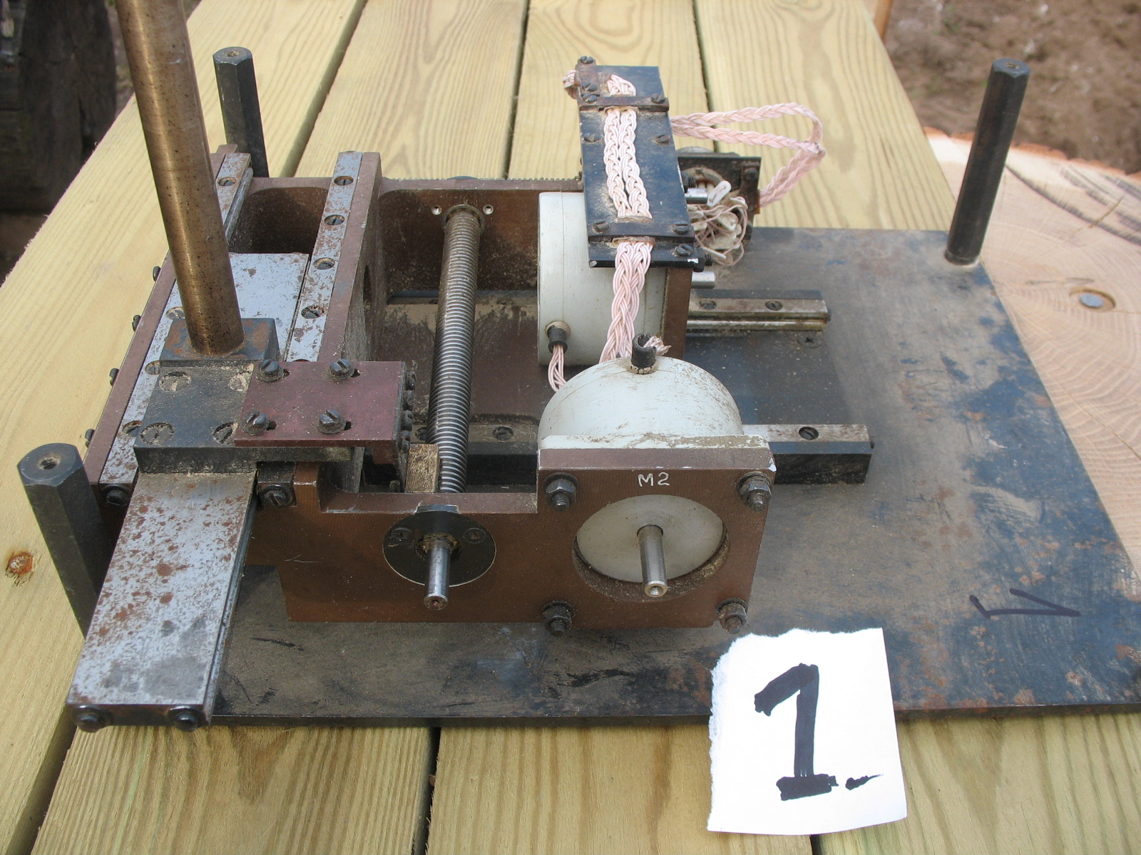 №1 на стальной пластине, отсутствуют шкивы и приводные ремешки, №2 без пластины и без гаек (гайки вроде отдельно где-то лежат) шкивы с ремешками присутствуют. На совместном фото оси загнаны в крайние положения.