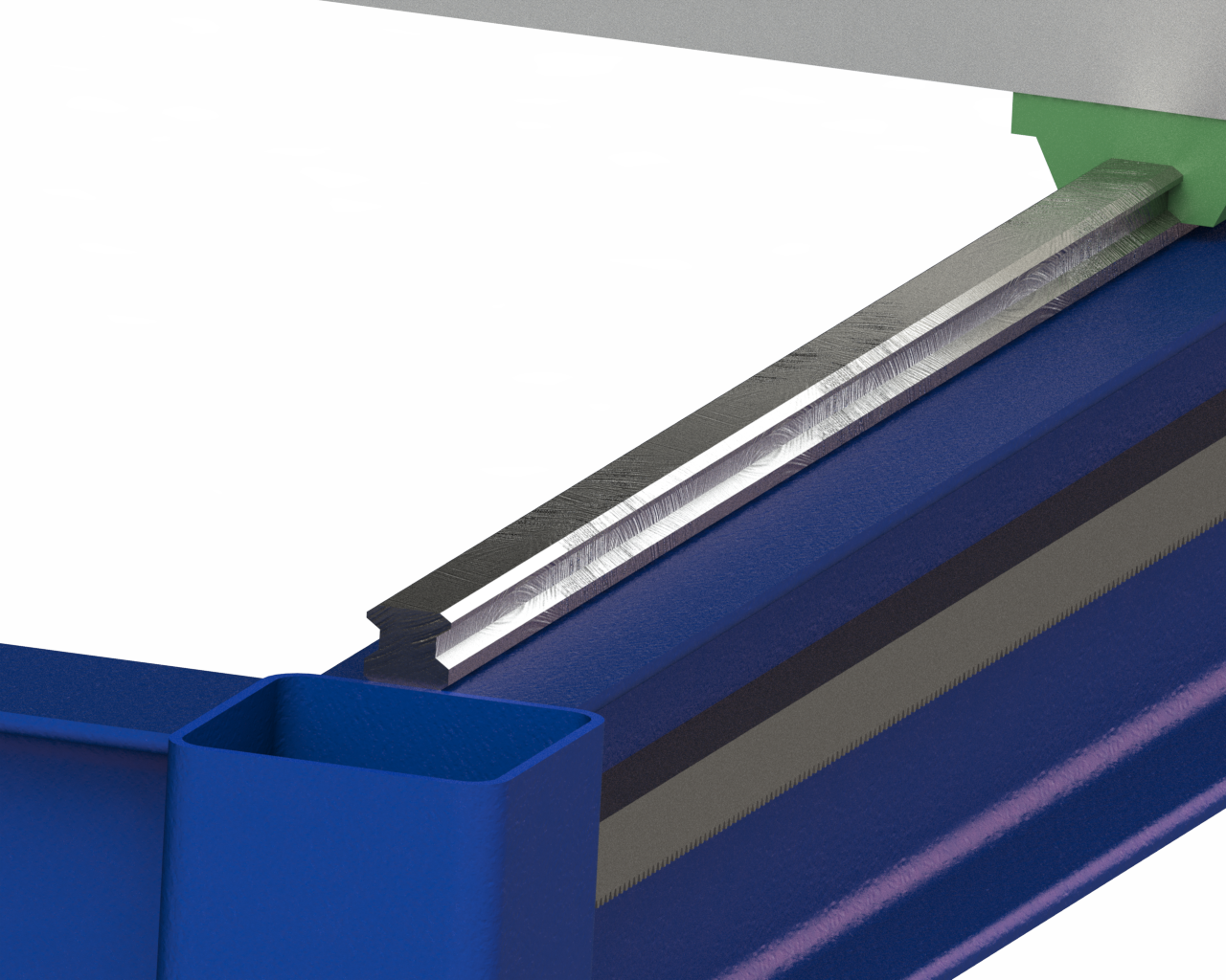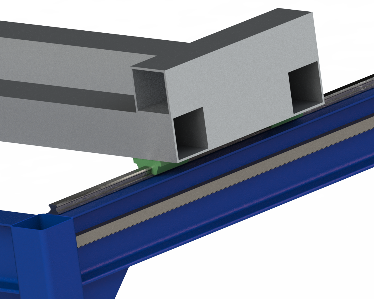 Остановился я на профильных направляющих, но если прикрутить их к двутавру как показано на приложенном рисунке (ось X), то нужно будет чтобы расстояние между направляющими с каждой из сторон (на каждом двутавре) было строго равно, иначе портал будет застревать при движении, да и гарантировать что сам двутавр ровненький тоже не могу. Есть вариант прикрутить направляющие сверху, но тогда неясно как к фланцу линейного модуля прикрутить алюминиевую пластину на которой будет держаться двигатель с редуктором, для передачи вращения через шестерню на зубчатую рейку.