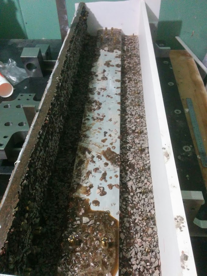 Также расставляем по шаблону закладные, и ставим люминиевую трубу 100*40, которая нам сформирует нишу под винт ШВП. Сначала заливаем первый тонкий слой пожиже, чтоб при заливке основной массы не сдвинуть закладные, даем подвстать сутки, и заливаем все остальное. Опять недельку отлежаться, после этого снимаем всю опалубку и отрываем балку от плиты. Оторвалась надо сказать довольно легко.
