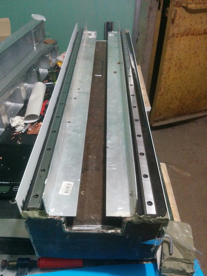 Ставим рельсы, жутко материмся выставляя их без упорного буртика. После токо как выставили их по индикатору по обоих осям и параллельности, формируем упорный буртик из смолы и молотого углеволокна: