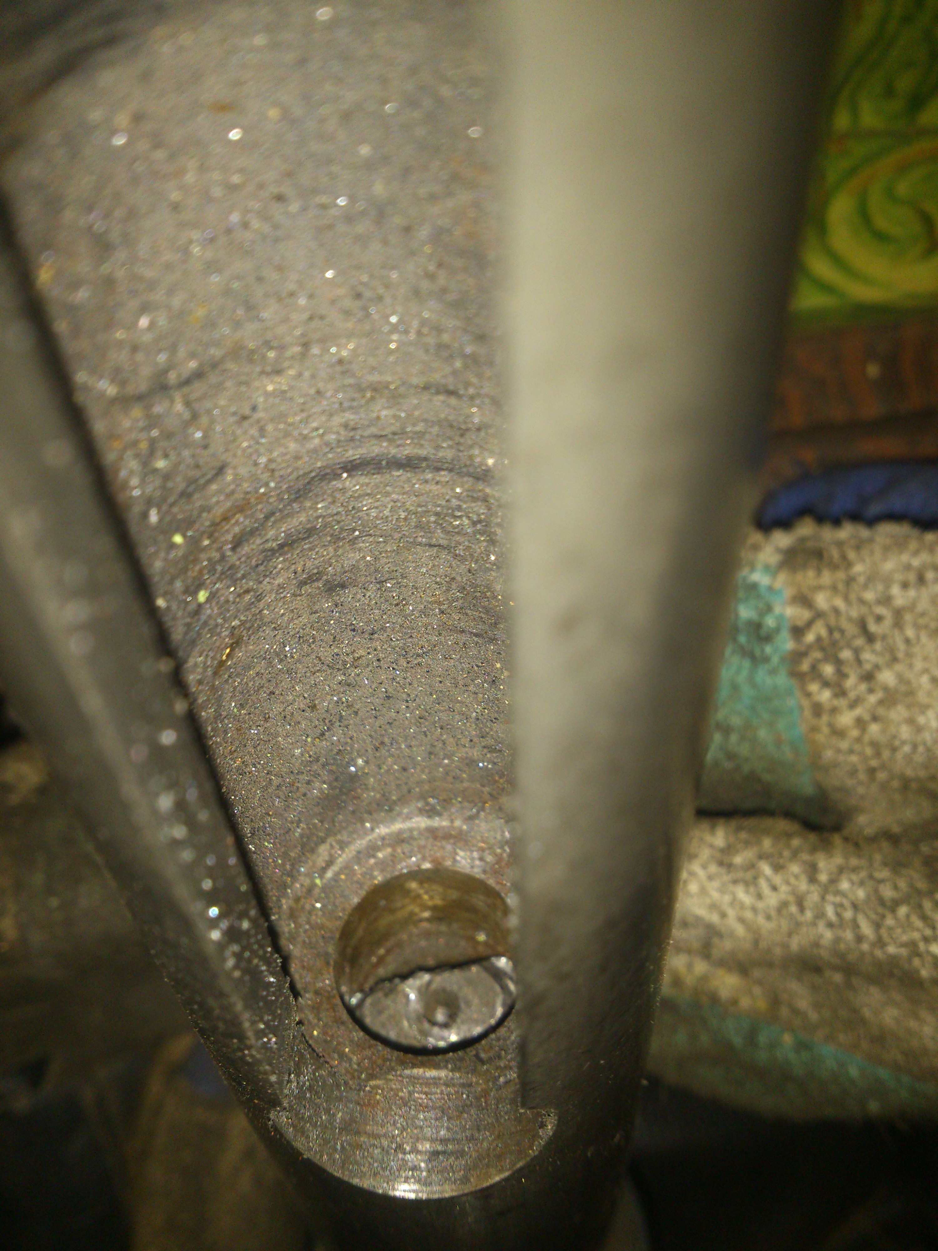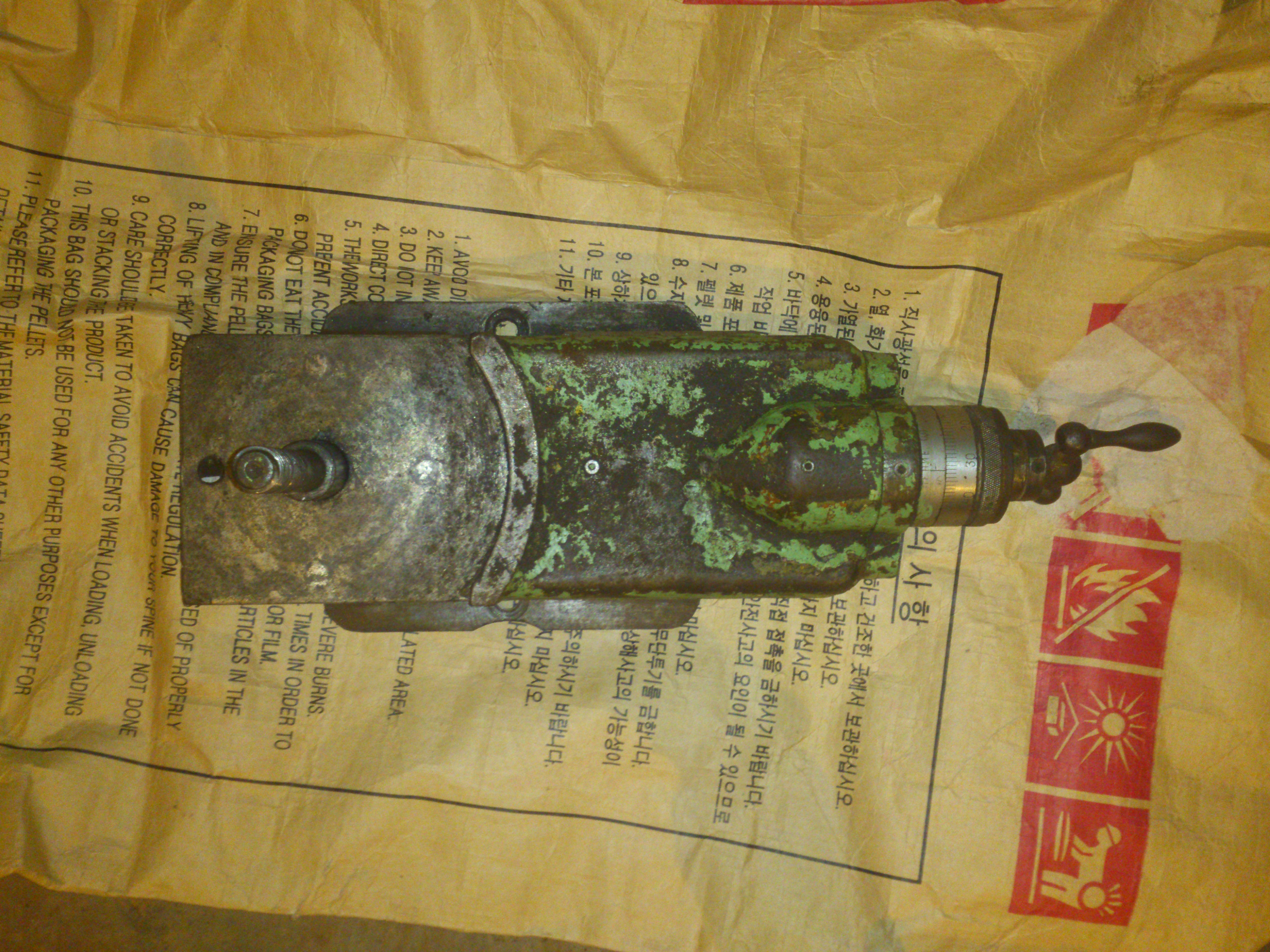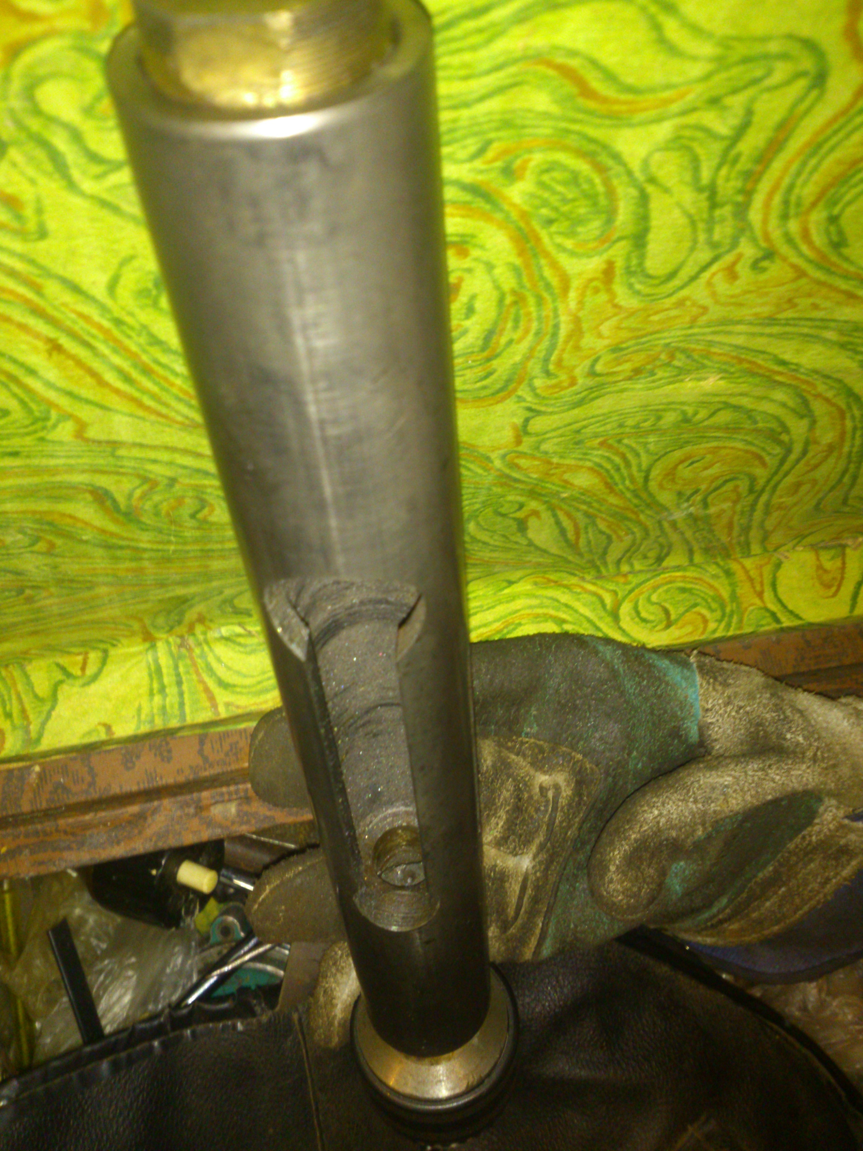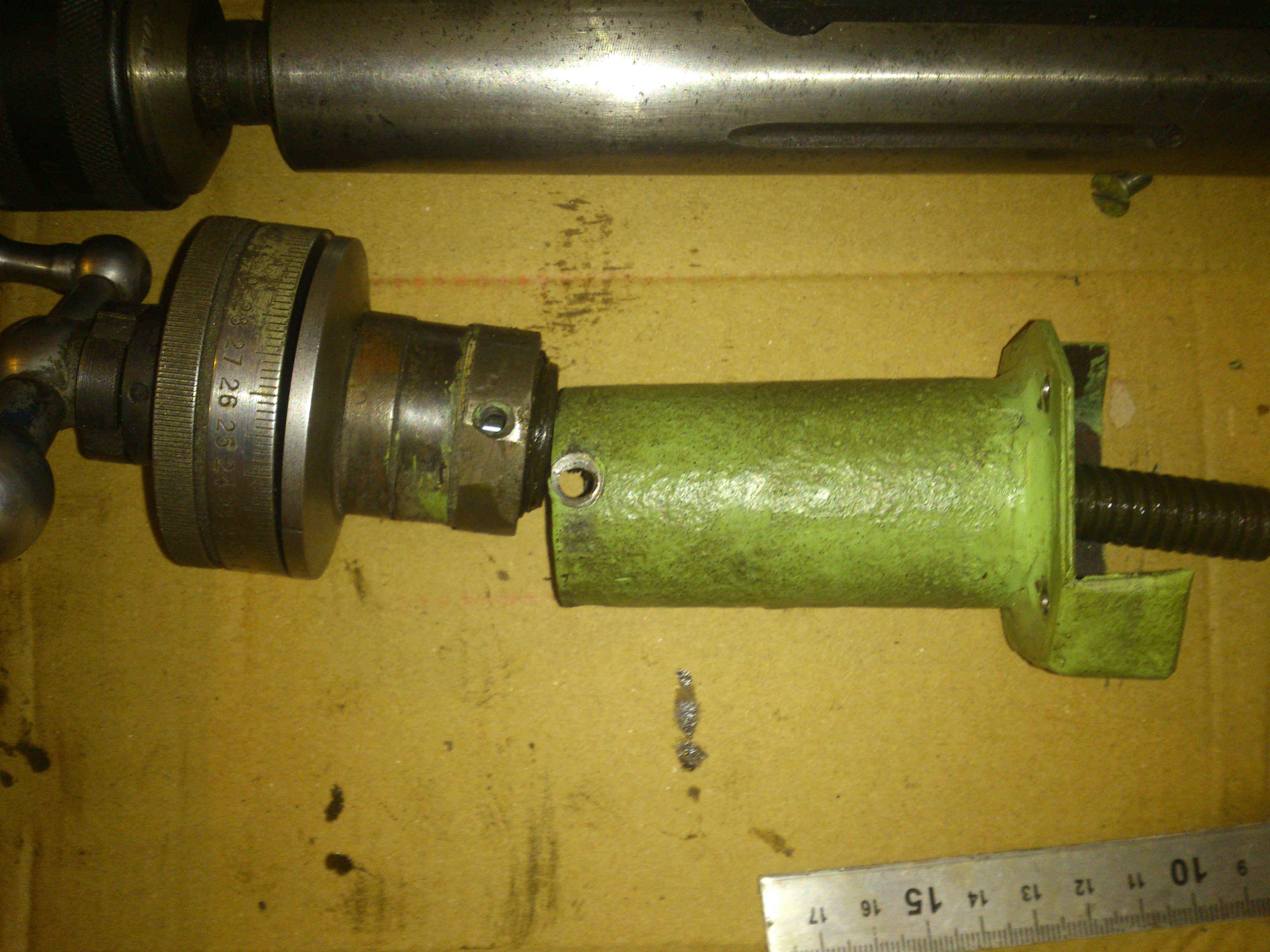 Тут тоже есть вопросы. ЗБ вроде как родная, а вот по пиноли вопрос. Уж больно она (пиноль) длиная. К ЗБ были приложены руки основательно, но вот хорошо это или плохо пока не понял, но минусы уже есть в виде неизвлекаемых конусов. Палец-ограничитель хода пиноли - просто кусок железки проточенный. Сзади к бабке приросло нечто из куска трубы-удлинителя, уже к оторому крепится винт с лимбом. С лимбом тоже видно рукодельничество, риски скорее всего самодельные, потому что после отсчета 19мм происходит сбой, и потом отсчет продолжается с 22мм, хотя это 23-й. Отверстий для выбивания конуса нет, если полностью втянуть пиноль, то там тоже нечему вытолкнуть конус из пиноли. В итоге имеем в пиноли застрявший конус, который я никак не могу извлечь. Пытался выбить ударами по патрону через проставку - не пошло. Вибать выбивать надо сквозь пиноль. Принимаю советы.