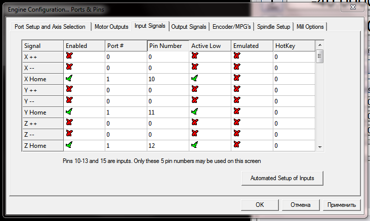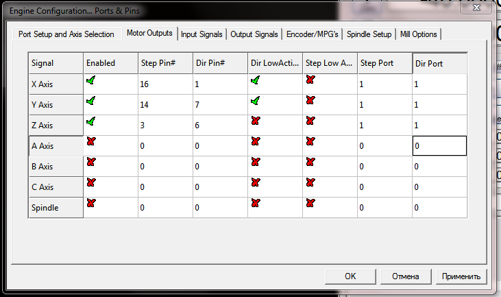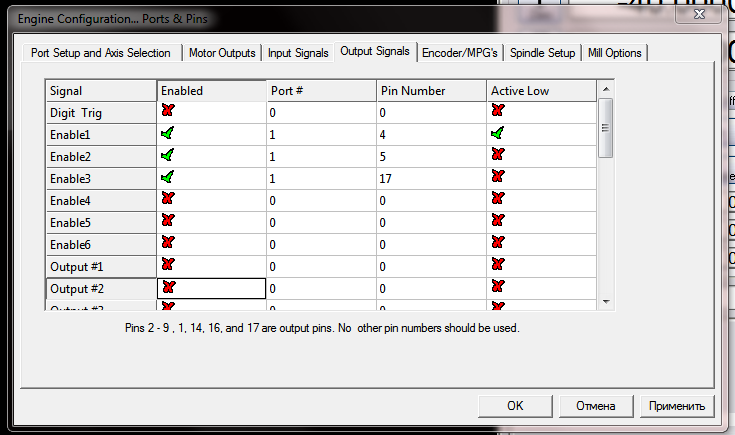 Я убрал везде все галочки кроме Motor Outputs, Output signal, внимательно проверил пины по табличке в инструкциях, перегрузил комп и о чудо! Заработало!