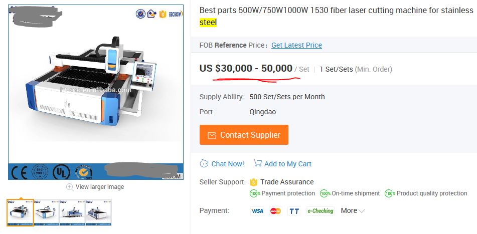 Я лазеры не произвожу. Лазер от IPG чтобы резать 2мм источник(лазер что то 200ватт) + башка стоил 30килобаксов. Лазер в 1квт стоил 70килобаксов + нужно купить голову 5-10килобаксов + электроника поддержания зазора. Цены были пару лет назад.