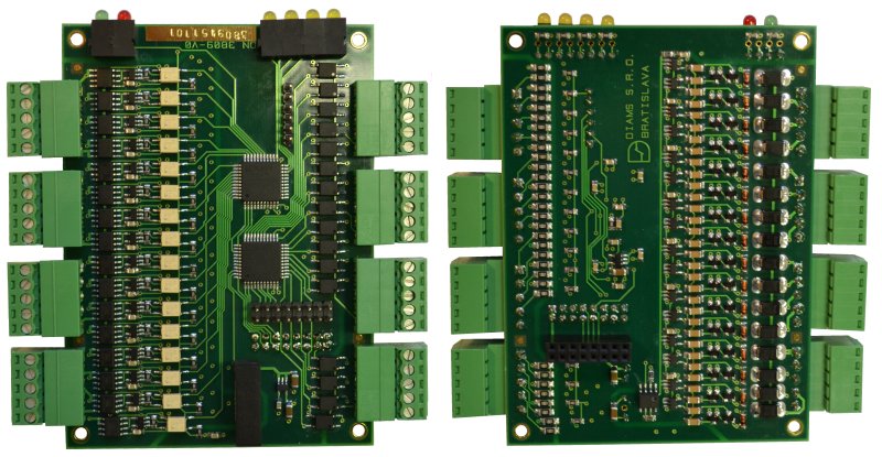 - 16 цифровых выходов 0-24В. Выходы гальванически изолированы, объединены для четверки, каждый выход в четверку