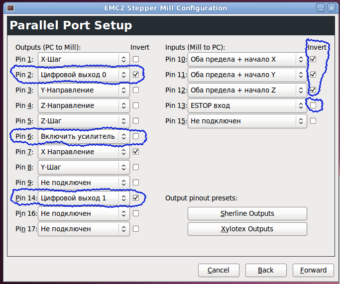 emc2 Parallel Port (lpt) Setup Pin-s for HY-TB3DV-M Рабочие настройки