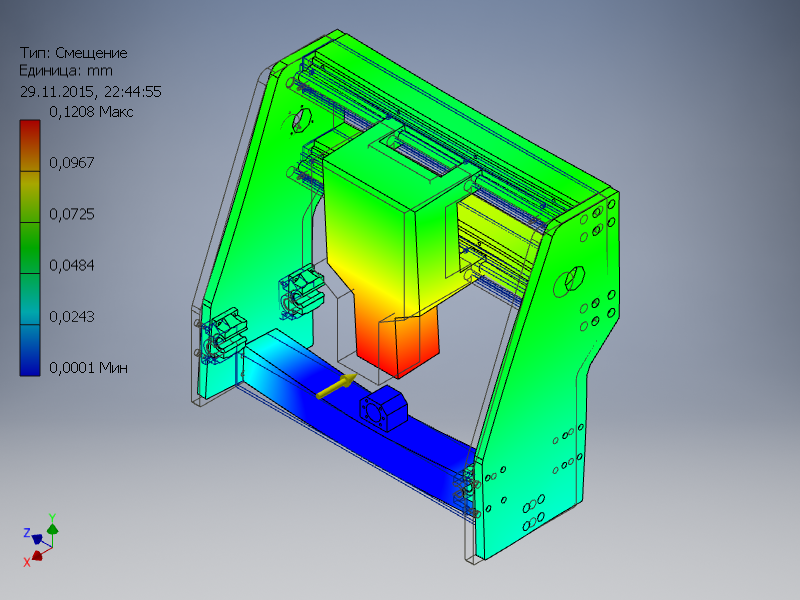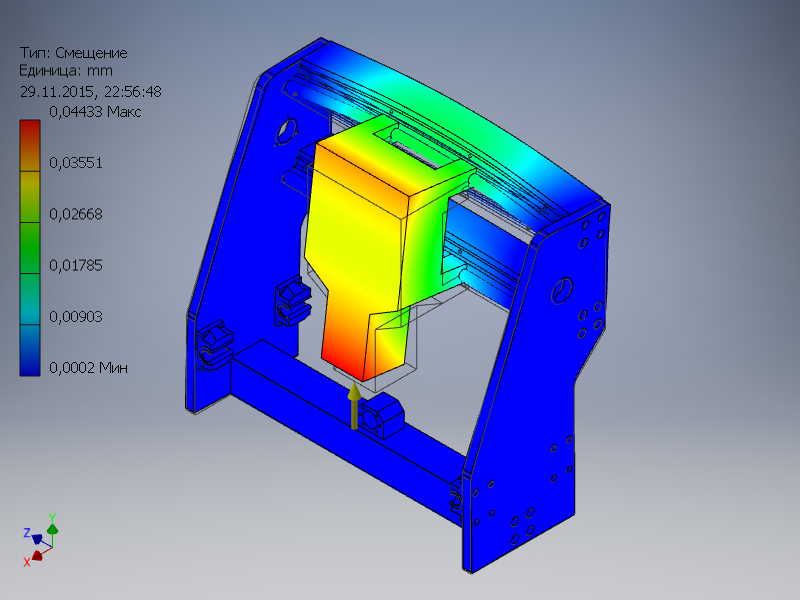 Вот смещения в крайнем положении оси Z (Y: 0.114мм, X: 0.14мм, Z: 0.022мм). Действительно, сейчас вклад нижней балки гораздо больше, но с другой стороны верхние балки меньше выгибаются, и суммарное смещение фактически не поменялось.