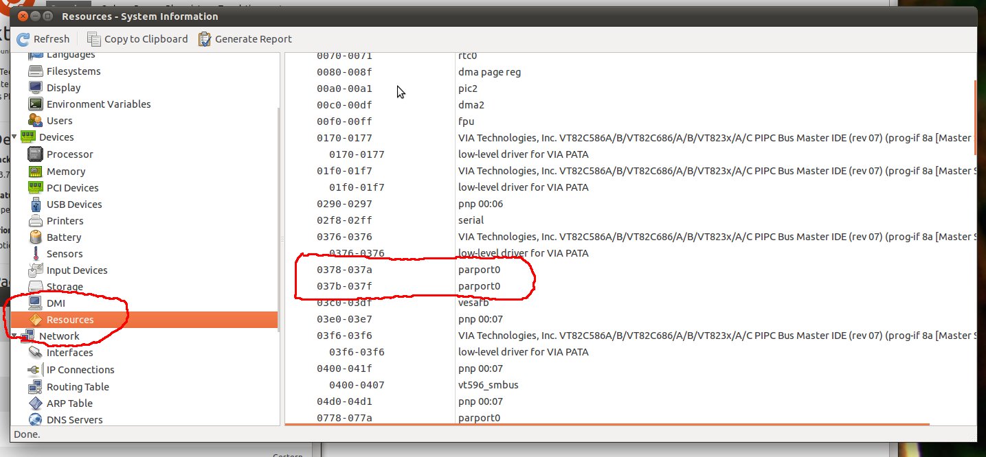 Чтобы найти адрес парпорта можно поставить hardinfo и посмотреть там: