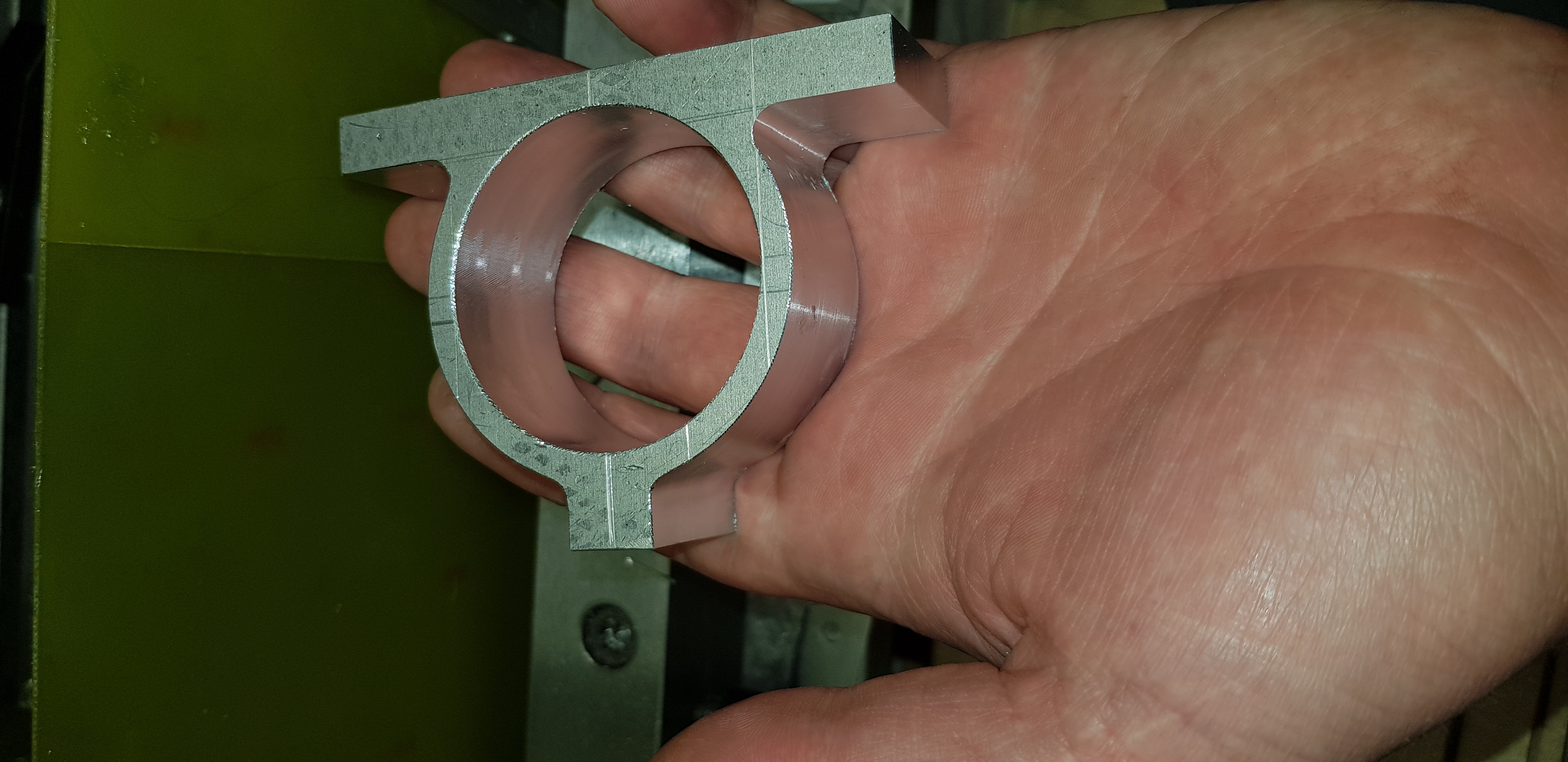 Вот решал хорошему другу запилить хомут под его гравер с шпинделем 52мм. Мой самодельный низкоскоростной шпиндель паказал себя в работе очень хорошо в размер попадает 0.02-0.03мм попадает с чательным обмером диаметра фрезы. Осиливает глубину фрезерования паза 6мм 10мм фрезой твердосплав с скоростью 150мм в мин с оборотами инструмента 1300. Меня только радует. Момент у сервы 750w через понижающии редукто 1.6:1 практически незамечает нагрузки по аллюминию. Хочу прикупить фрезу как у Макса с пластинами диам. 50мм для прохождения плоскостей.
