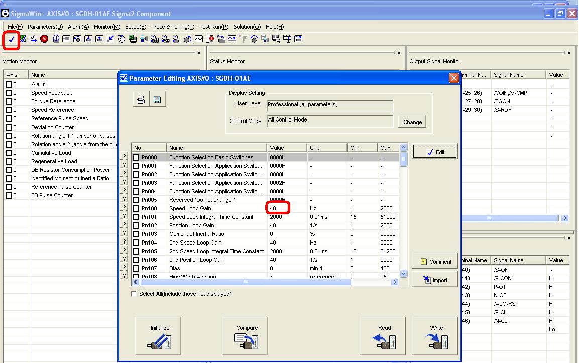 Если ты игрался с настройками Fn001 = d0004 то понимаешь теперь что от этого зависит жесткость сервы(вала). Так вот на Fn001 = d0001 у тебя серва не будет вставать в позицию.Потому нужно подобрать параметр Pn100 чтоб и не пищало и быстро реагировало