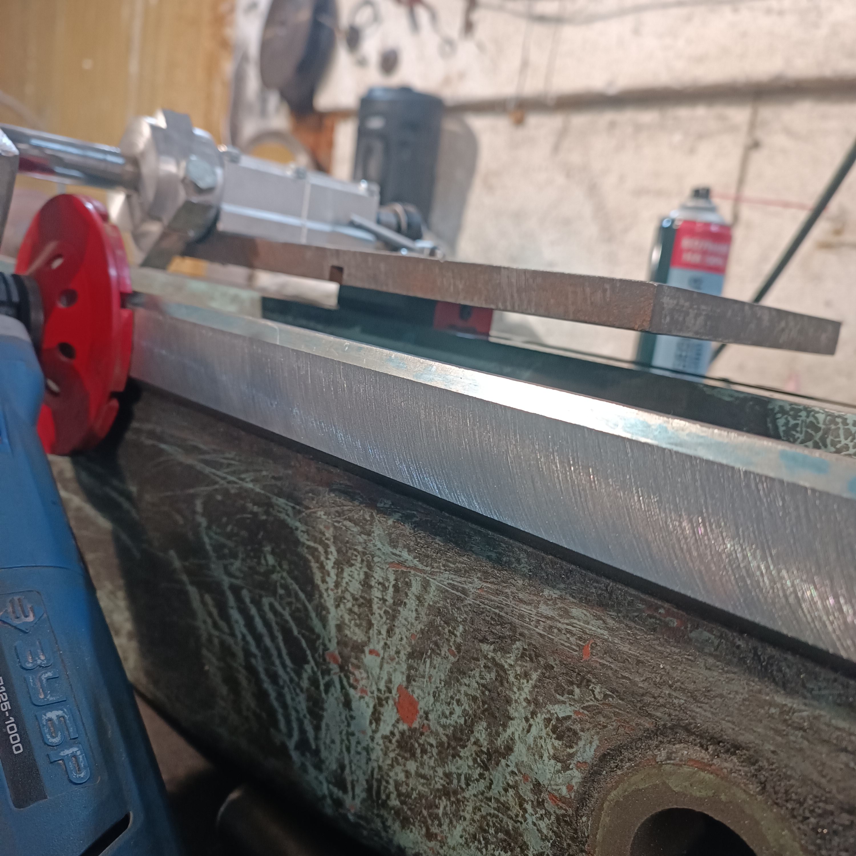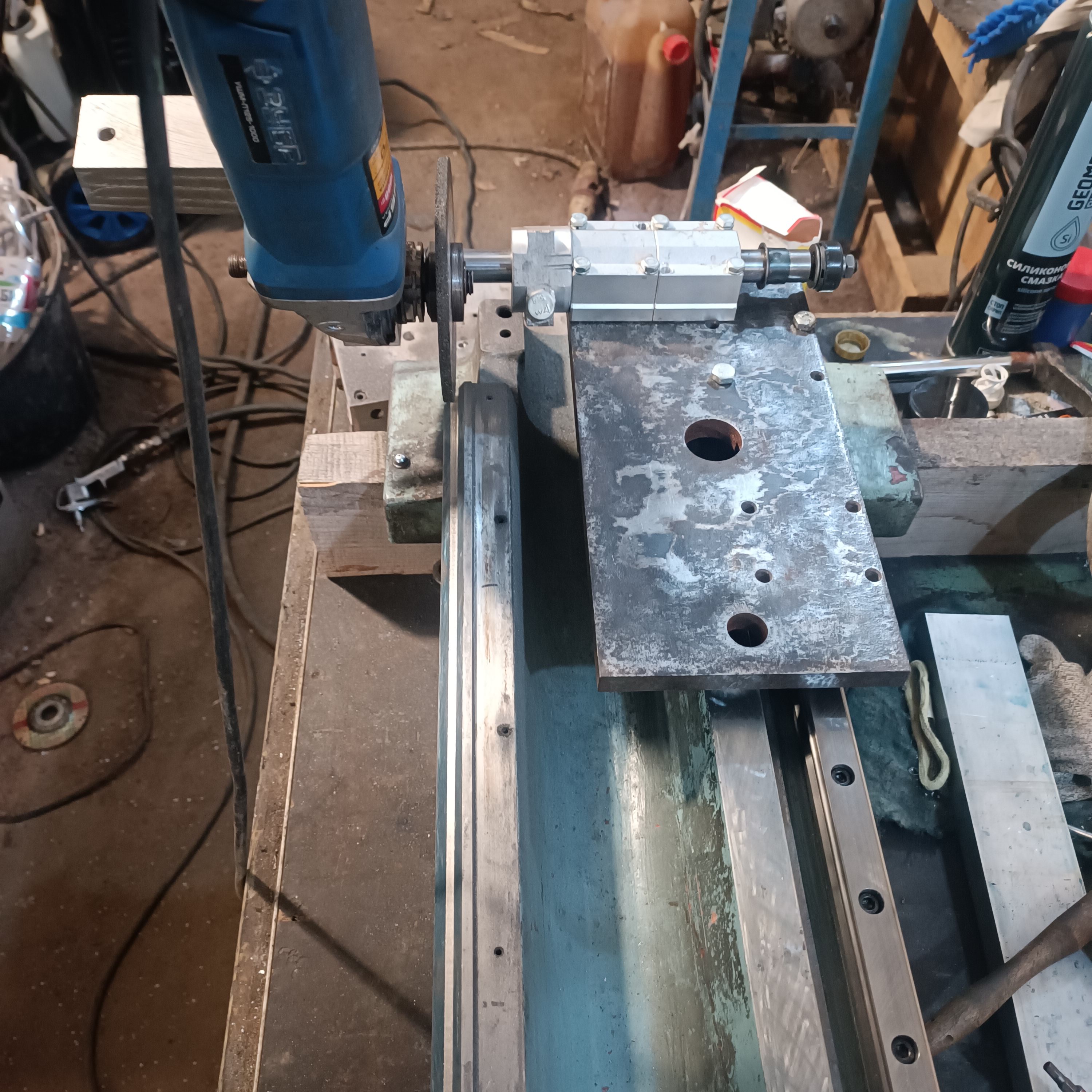 Всё-таки решил поставить рельсы ровно . Не нашёл кто отфрезерует ,пришлось городить приспособу и болгарить.