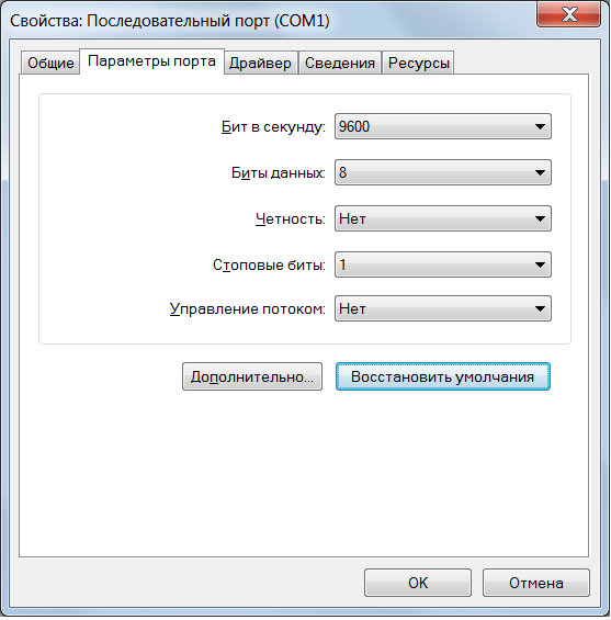 Также вычитал на форумах что необходимо каким-то особым образом конфигурировать настройки COM порта, но ни в одной из тем не нашел информации связанной с этими настройками.