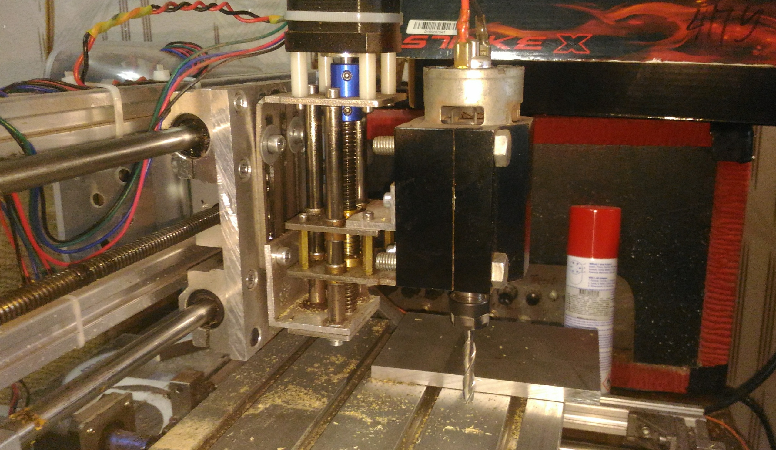 Прочитав все 100+ страниц темы, нашел модуль перемещения по оси Z на алиЭкспрессе. Купил, усилил его алюминиевым уголком, как здесь и писали. Сделал переходную плиту для него из 8мм алюминия+поставил новые линейные подшипники. Получившаяся конструкция - самое худшее(на мой взгляд) решение и трата времени+сил+денег. Слишком большой "вылет" шпинделя делает большой рычаг. Из за этого, станок стал хуже чем был с пластмассовыми деталями.
