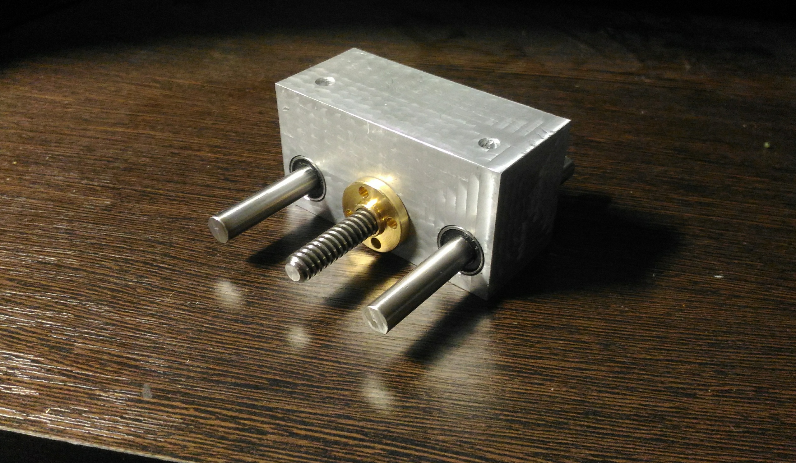 Пока делал верхнюю и нижнюю пластины(ручной ножовкой пилить то еще удовольствие) - мне сделали сам модуль перемещения. Подшипниковые втулки, старые, запресовал "на горячую", гайку латунную использовал тоже со старого модуля перемещения.