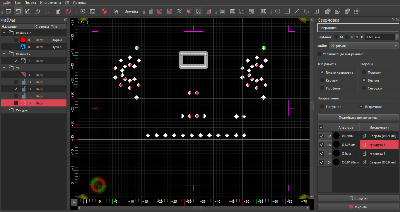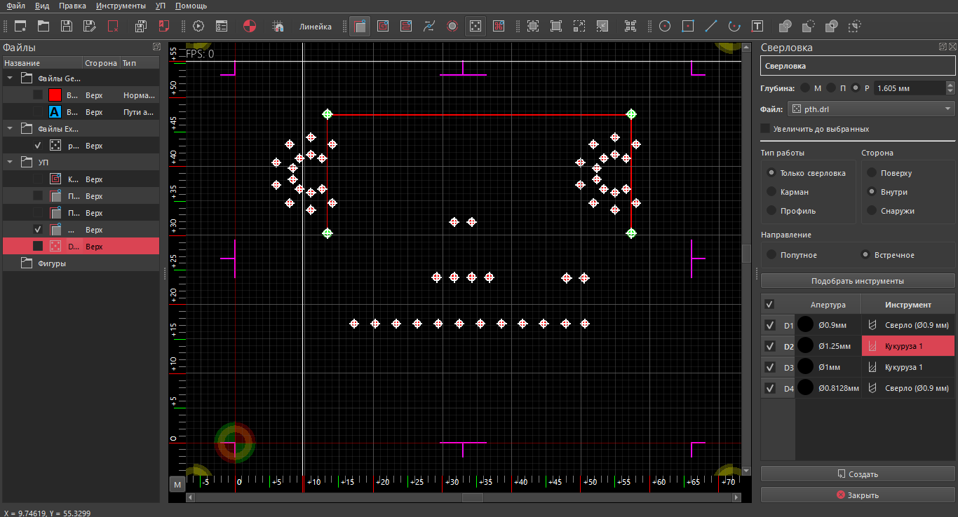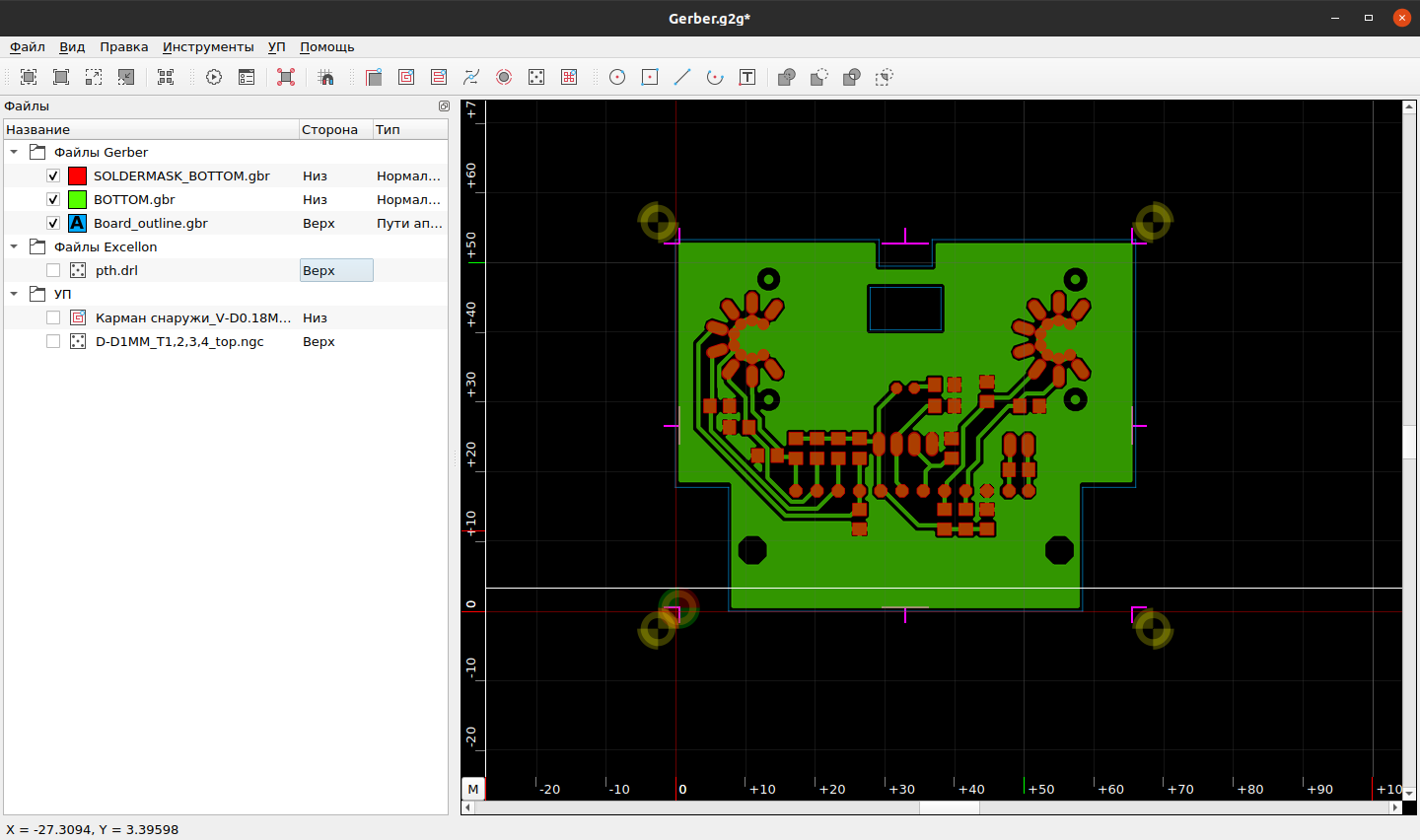 Вот такая картина, если просто загрузить гербера и ничего не трогать. Видим, что программа определила, что ваша медь bottom и переключила на "низ", ну а сверловка грузится для верха, как я и говорил.