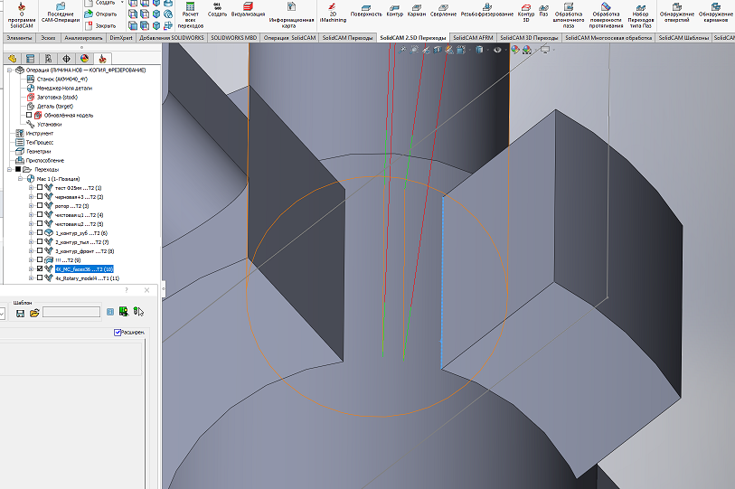 Второй вопрос такой: как выбрать начистовую материал между выступами на цилиндрической детали концевой фрезой, хотелось бы чтоб траектория начиналась параллельно первому выступу, касаясь стенки выступа стороной фрезы а заканчивалась касанием стенки второго выступа противоположной стороной фрезы, то есть фреза должна одновременно смещаться перпендикулярно оси вращения. Стенки выступов параллельны перпендикулярам проведённым от оси вращения по центру самих выступов.