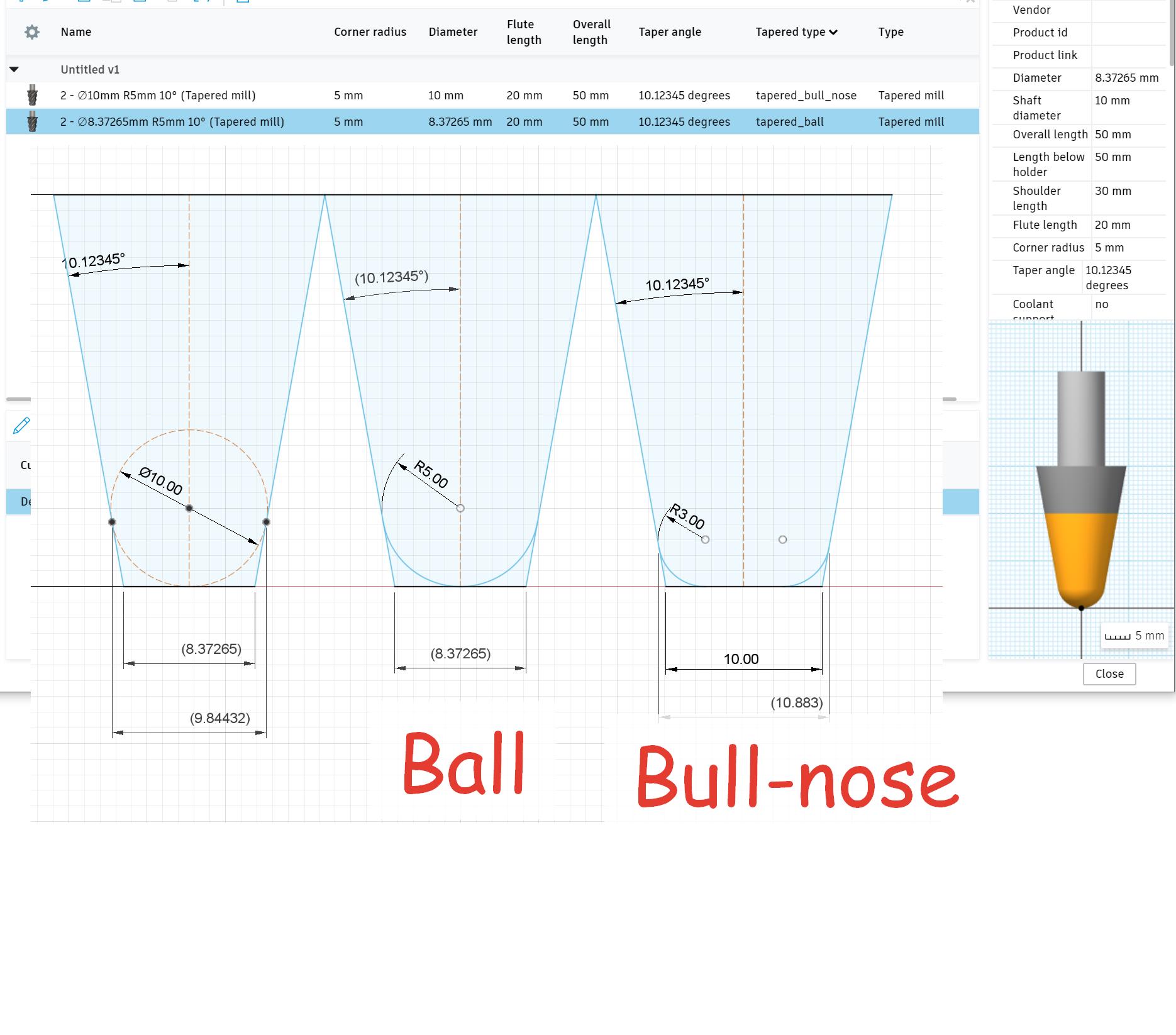 1)(левое) - это как вы себе представляете диаметр шара на конце. Померить его можно только по точкам тангенциальности - но там он меньше чем "эффективный" диаметр, (равным он окажется только если угол равен нулю) - в этом и прикол. Дальше два типа фрезы на выбор ball и bull-nose.