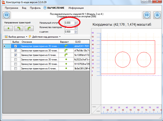 Все вроде бы как хорошо, но когда ставлю отступ от траектории например 0,5мм, построение тракетории идет с ошибкой.
