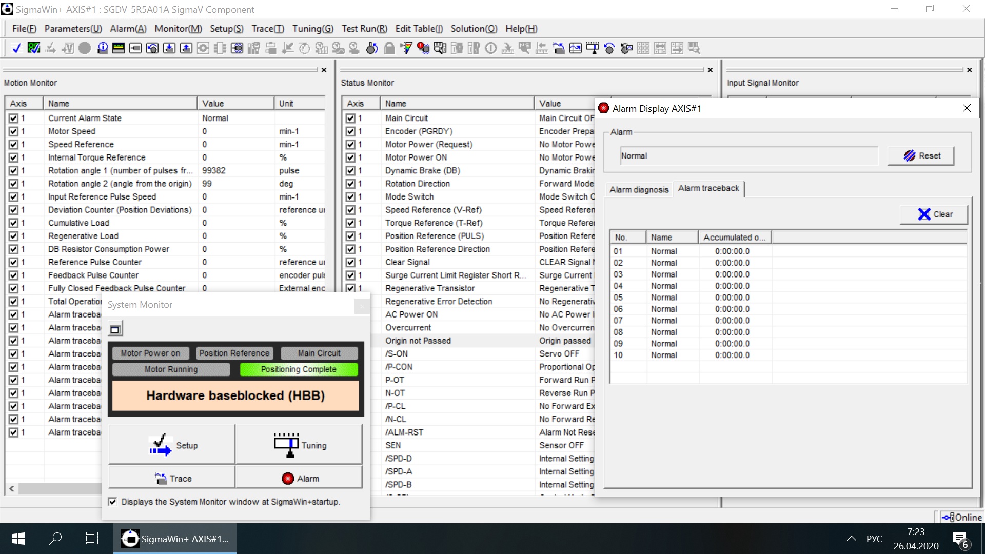 В том то и дело что ошибок нет в Alarm. Ни до попытки включить Servo ON, ни после. Лист ошибок пустой. При этом если вытащить заглушку безопасности, то пишет Hardware baseblocked (HBB) - ну оно так и по мануалу должно быть. А когда заглушка стоит, то просто Motor base blocked - где снять это программно уже не нашел.
