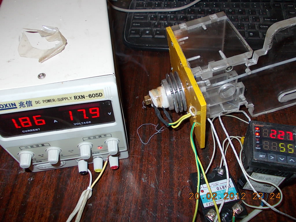 Голова из Ала выточена была (ранее фотки выкладывал). Намотал для изоляции пару витков на Ал тефлон (продается для станочко для запайки пакетов, атакже где продают ПВХ оконный профиль). Наматал нихрома. Для теплоизояции взял асбестошнурок (он применяется в сальниковой набивке - полно его на рынках). И все замотал ФУМом. Все.