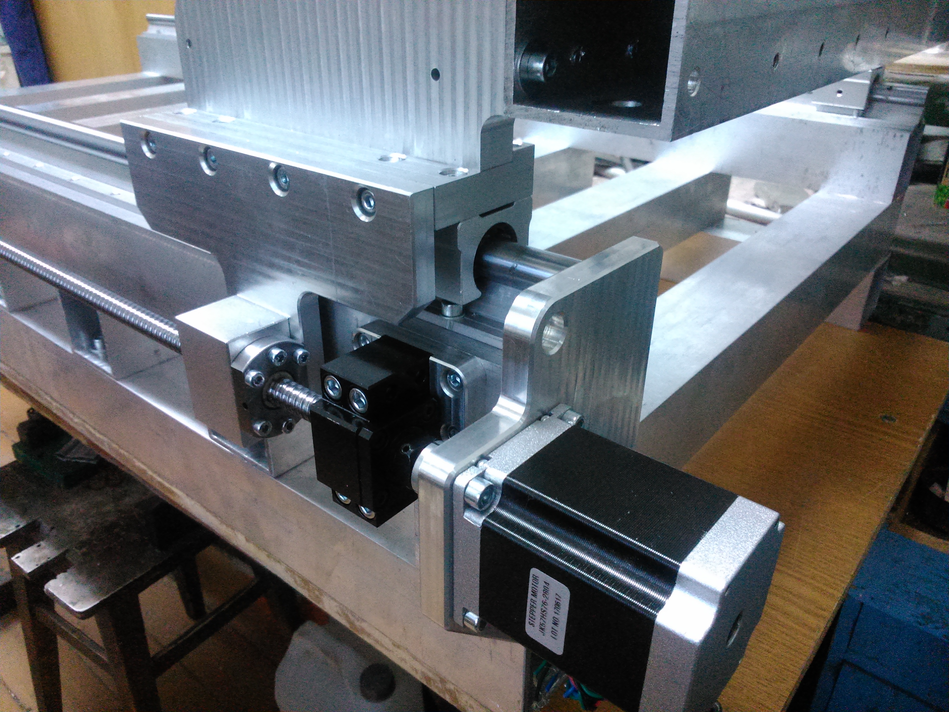 Параллельность портала столу вывел, по линейке, поставленной поперек , прямо на рельсы, одну сторону балки закрепил к боковине жестко, под вторую поставил импровизированный "домкратик"- болт с накрученной на него гайкой. Прокатывал ось Z вдоль портала и отслеживал значения отклонения по индикатору, "домкратиком" выровнял показания с обоих краев. Поскольку прямолинейность рельс на портале была выставлена заранее, дополнительно ничего юстировать не пришлось.
