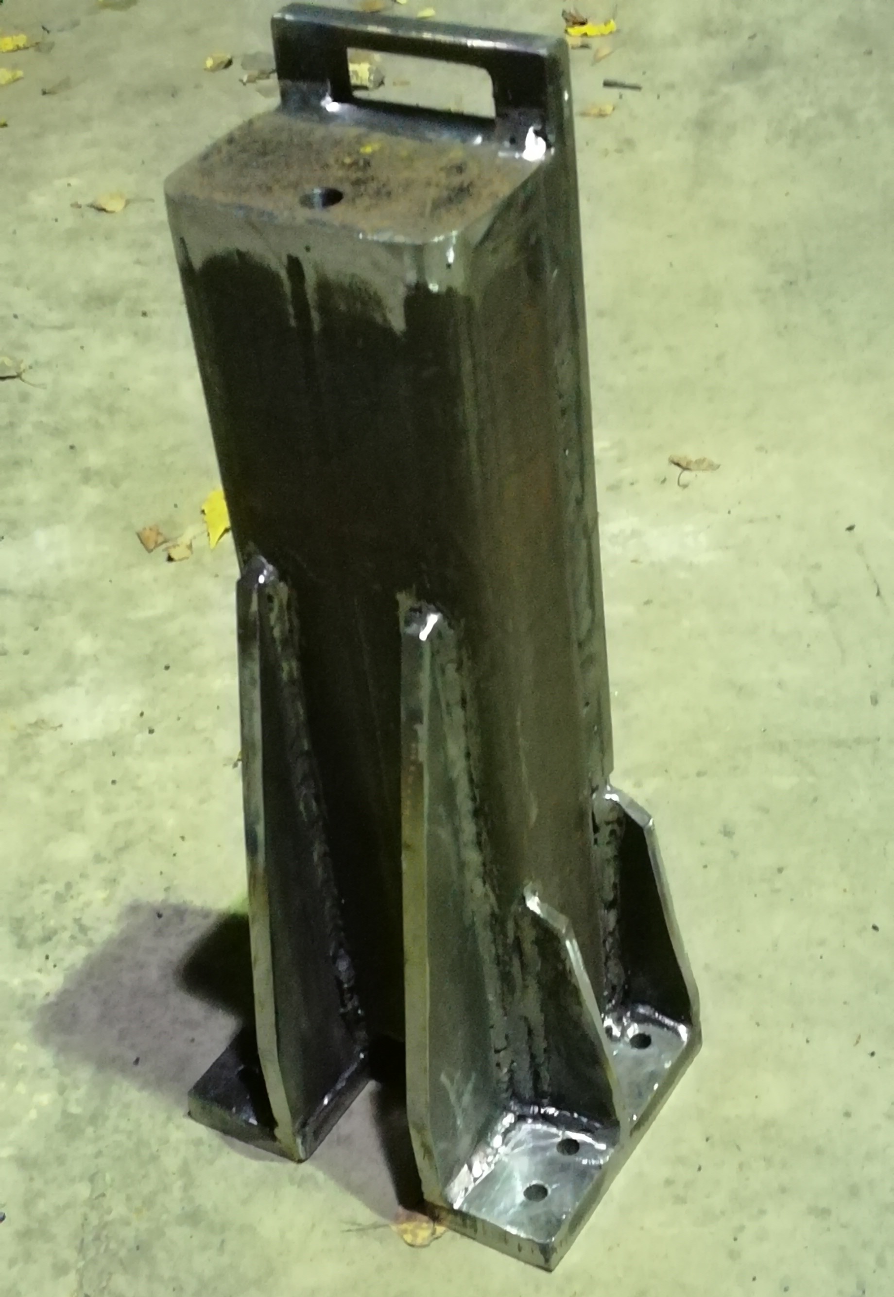 Колонну сварил и зачистил. Чуть изменил конструкцию в процессе сварки. Все технологические перемычки срезал, а одну верхнюю оставил в качестве ручки. Очень этому рад остался, без ручки эту штуку переносить жутко неудобно. Уж больно тяжеленная получилась.