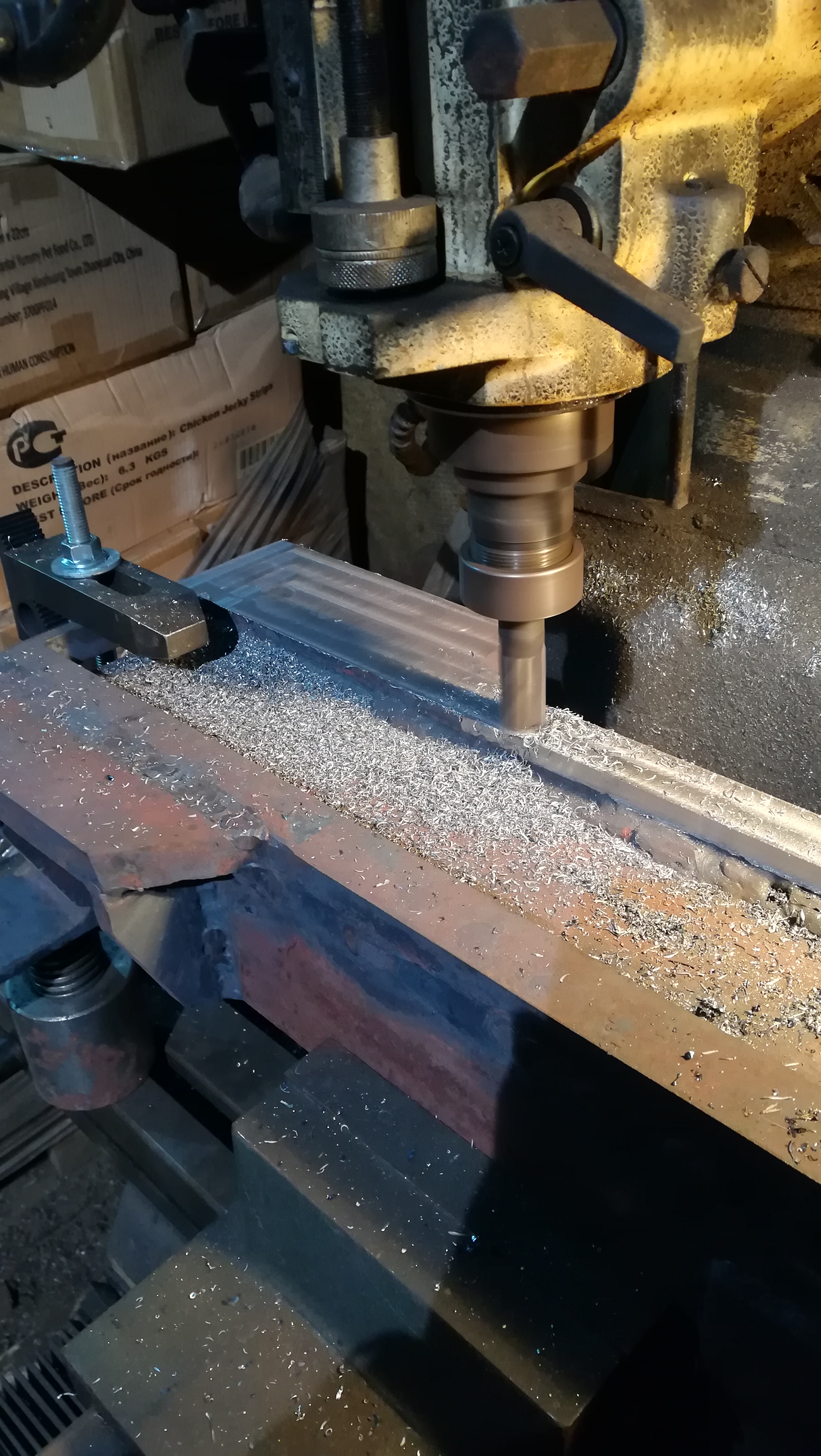Добрые люди пустили к фрезерному бесплатно на 2 дня. Мол неси фрезы и фрезеруй сколько хочешь. Купил две фрезы 20 мм по 180 руб. и стал к станку. Выставлял каждую деталь, неверное по 2 часа. Зажимал в большие тиски и подпирал фрезерными домкратиками.