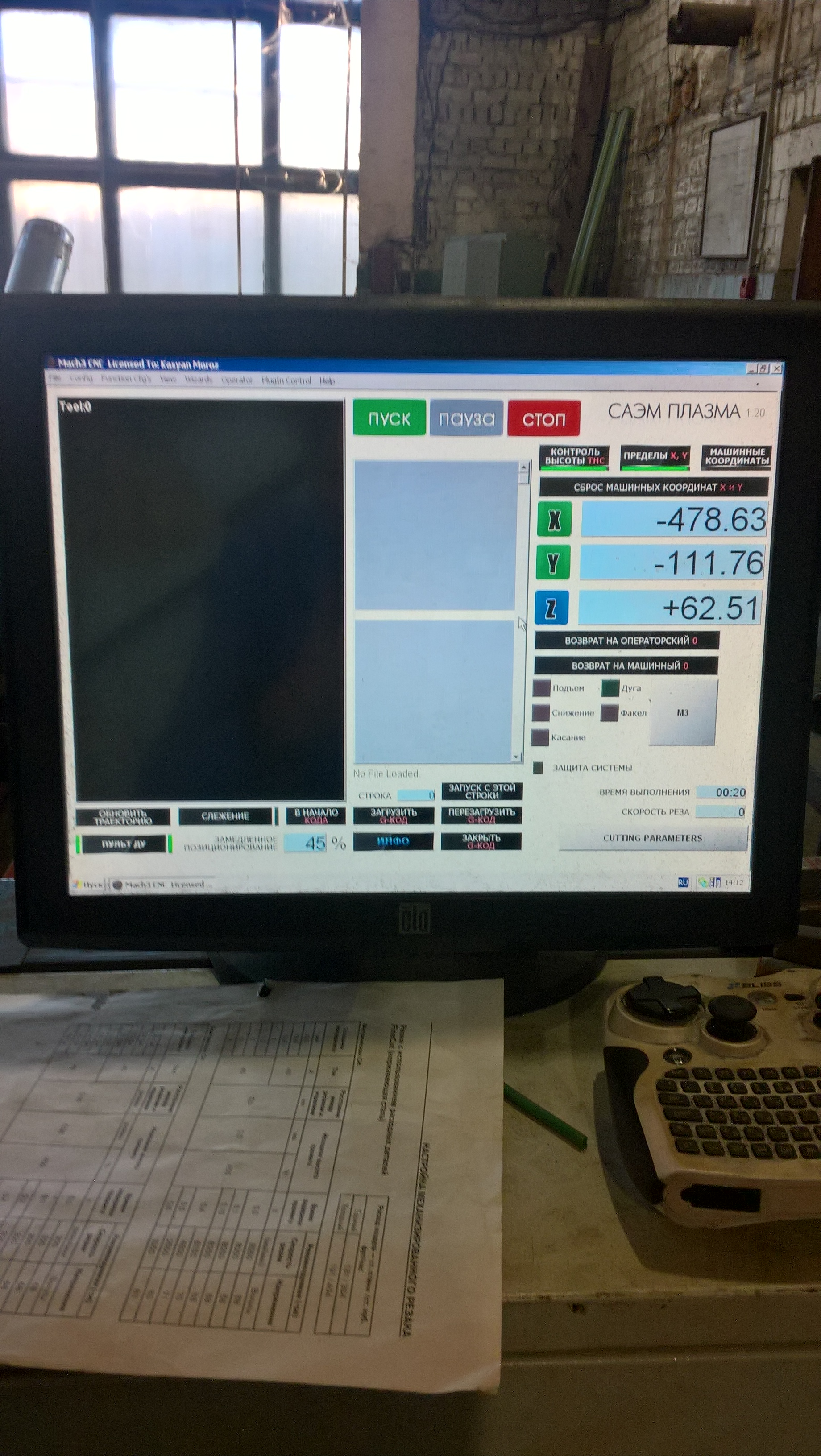 Видео по работе G кода который я выше выкладывал. Через маску сварочную смотрел - не заметил что касался в процессе реза, только при поиске металла (что подтверждает кнопочка "касание" на панели Мата)
