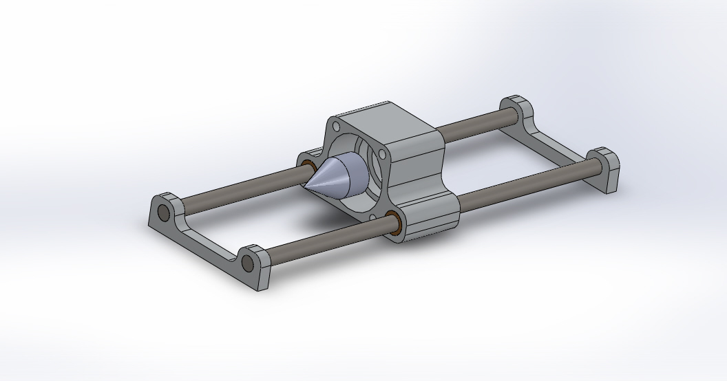 На ЧПУ делаю корпус под внутренности центра вращения. От амортизатора офисных стульев беру 2 вала диаметром 10мм, на рынке покупаю бронзографитную втулку с внутренним диаметром 10мм (искать в запчастях для электроинструмента) и собираю такую конструкцию.
