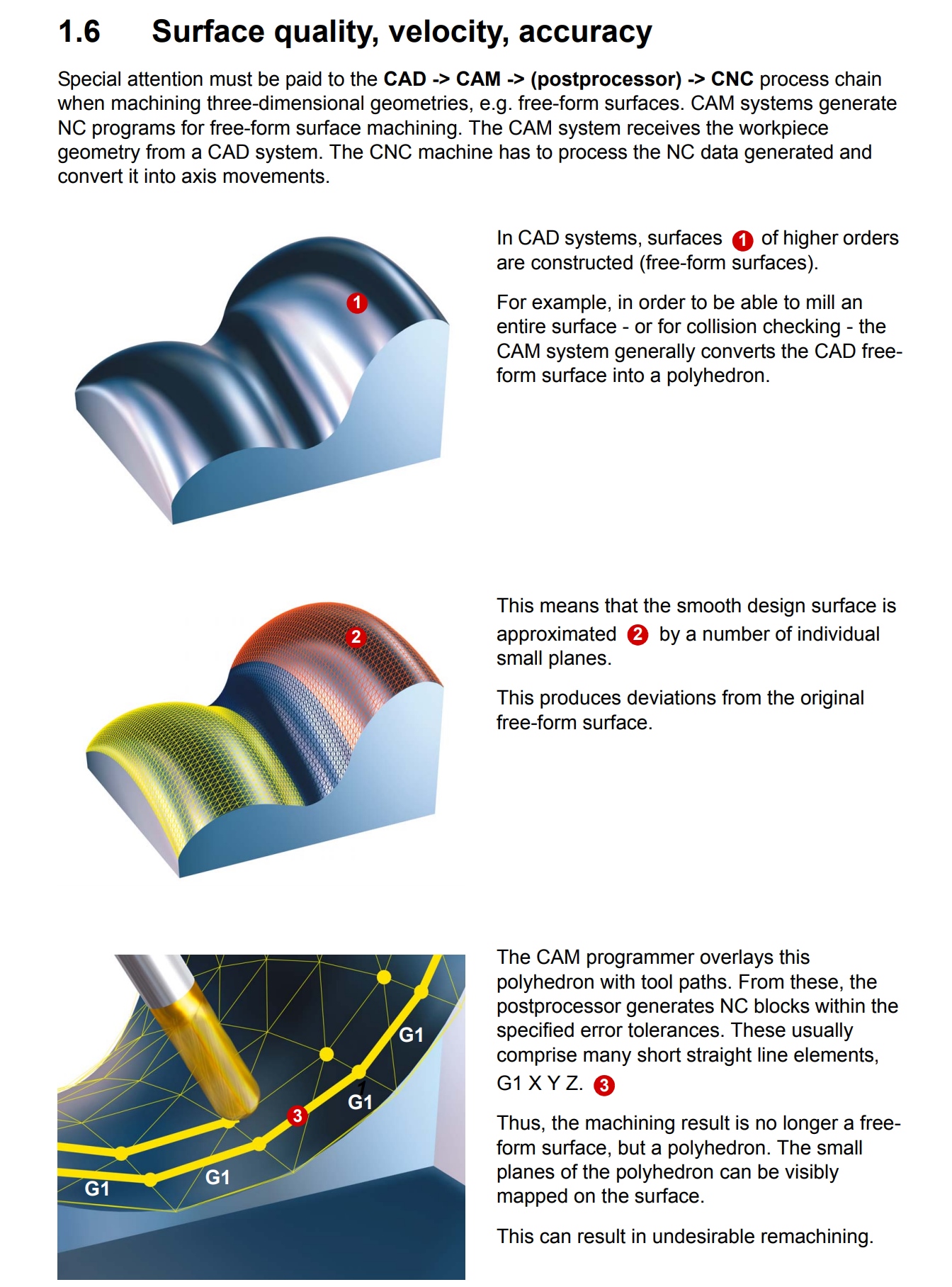 НО во ВСЕХ современных чпу никто не двигается точно по коду, в этом абсолютно нет никакой необходимости - везде давно используют nurbs интерполяция. код интерпретируется, геометрически преобразовывается: если это длинные прямолинейные сегменты или дуги - на их стыках строятся кубические сплайны, если это куча мелких линий - апроксимируется одним гладким nurbs c заданной точностью(параметры сглаживания/точности следования), сплайны/полиномы соединяются с контролем кривизны - и это обязательно делать для g2 непрерывности пути(геометрическая кривизна/непрерывность пути прямопропорциональна рывку), чтобы потом возможно было строить профиль скорости с контролем рывка (s кривые).