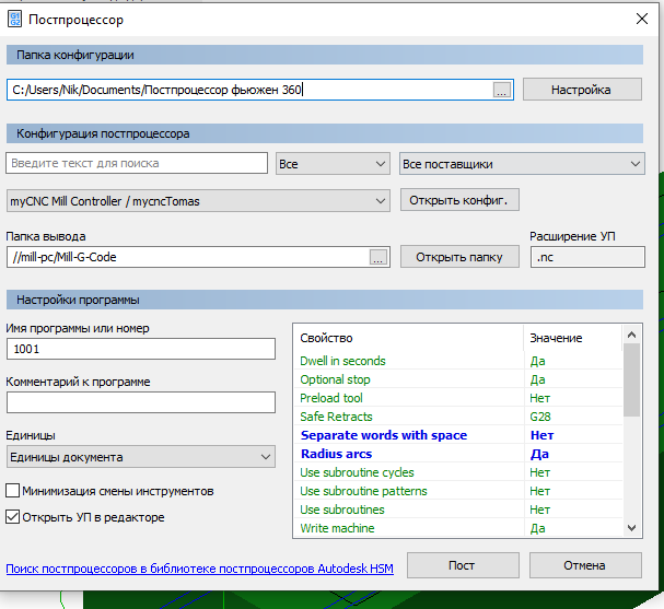 Я вам уже написал - нужен конфиг с поворотной осью C - например токарный хаас(или другой тjкарный с live tool) как раз такой готовый... лезте в него. Там надо только поправить координату Х в радиусе, а не диаметральном размере. Можно фрезерный поправить(по умолчанию в них вообще нет преобразований декартовых в полярные, ну или я не видел ни в одном фрезерном пп их), но я сейчас на вскидку не скажу весь список изменений... надо сравнивать их. Диаметр убирается в самом начале - "scale:2" поиском найдитеRafcamera писал(а): ↑ P.S. Ну или другими словами тот же вопрос: можно ли создать с нуля машину, у которой стол находится на поворотной оси C, та на линейной оси Y, а шпиндель на линейной оси Z?