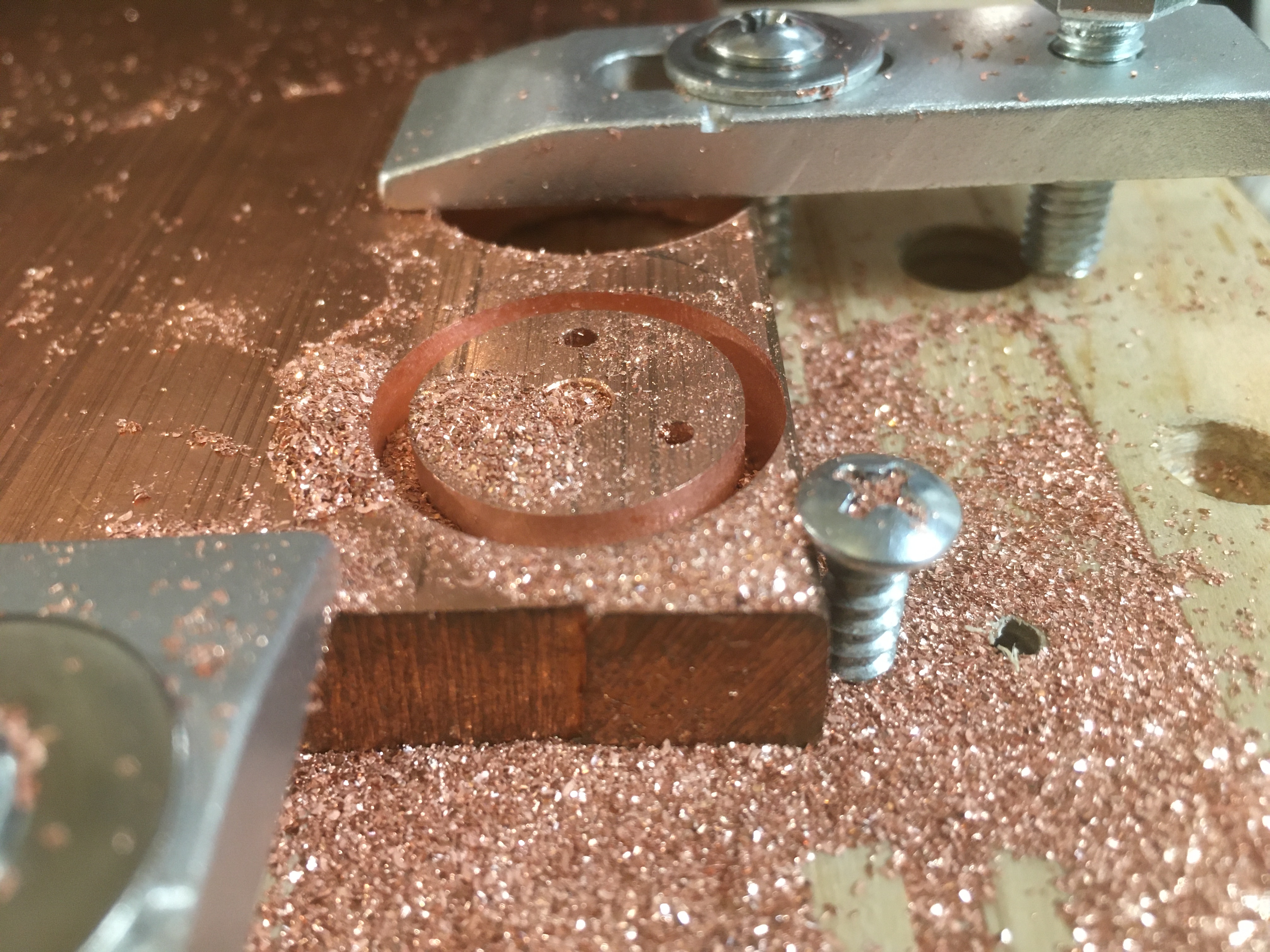А ты обрезку по контуру попутное или встречное фрезерование ставил? Если попутное, диаметры вверху и внизу одинаковые получились? А как эта медная втулка будет крепиться к алюминиевому радиатору, запрессовка на горячую?