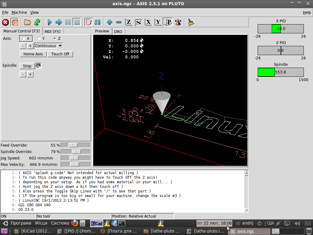 Оси ездят и шпиндель запускается ... к плате доберусь и убавлю длину кабеля до ЛПТ ..... попытаюсь скрутить пары типа информационный с землей, может помеха какая то и какой то нолик или единичка не добежала