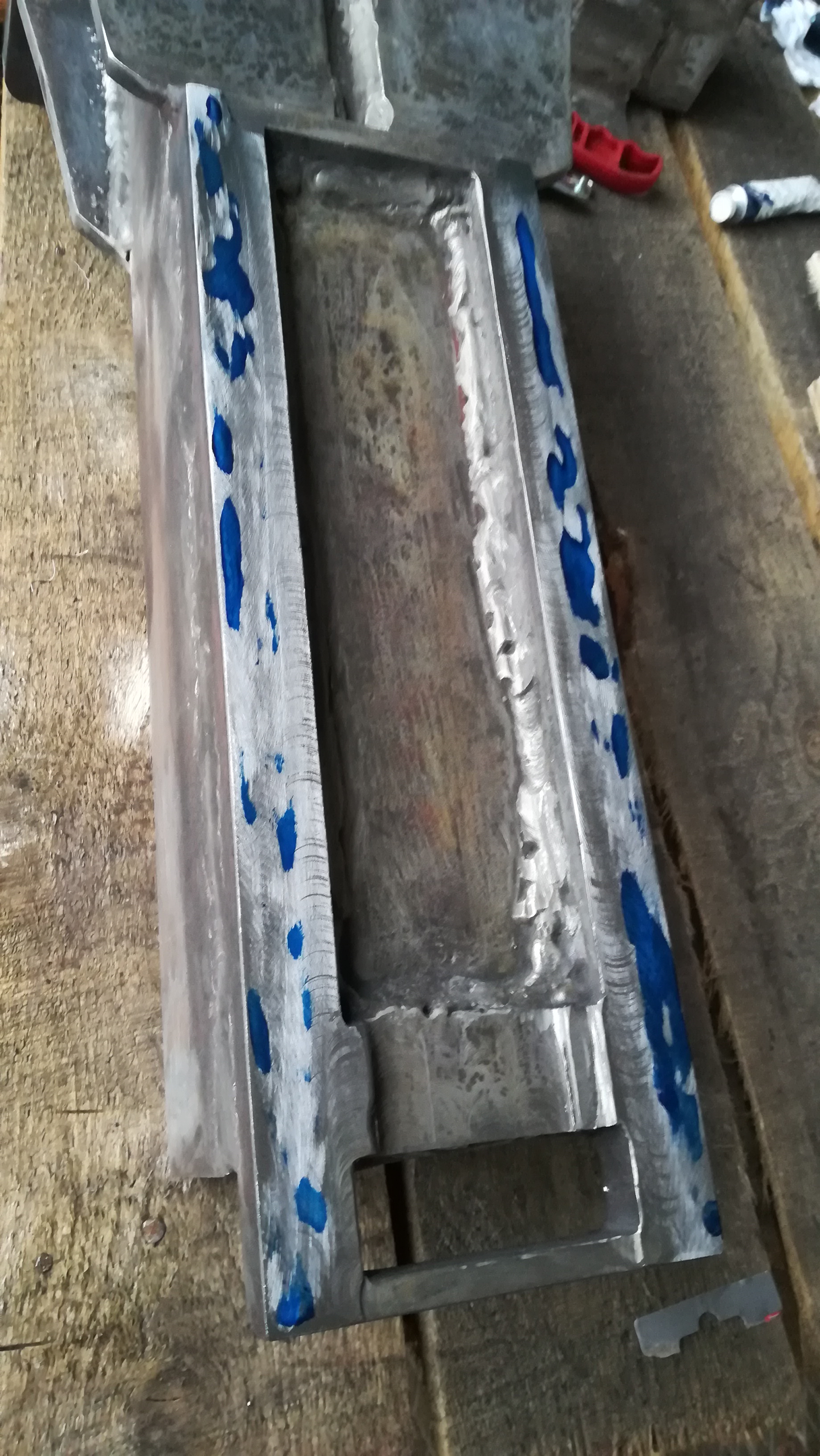 После того, как сбил шероховатость от фрезы, приложил к плите. Получился такой рисунок. 3-соточный щуп никуда не лез, двух-соточный с трудом кое-где пролазил. Так что плоскостность в 3 сотки после фрезеровки - это вполне себе не плохой результат. Шлифовка не планируется, планируется немного ручной шабровки. Постараюсь довести плоскостность в 1 сотку.