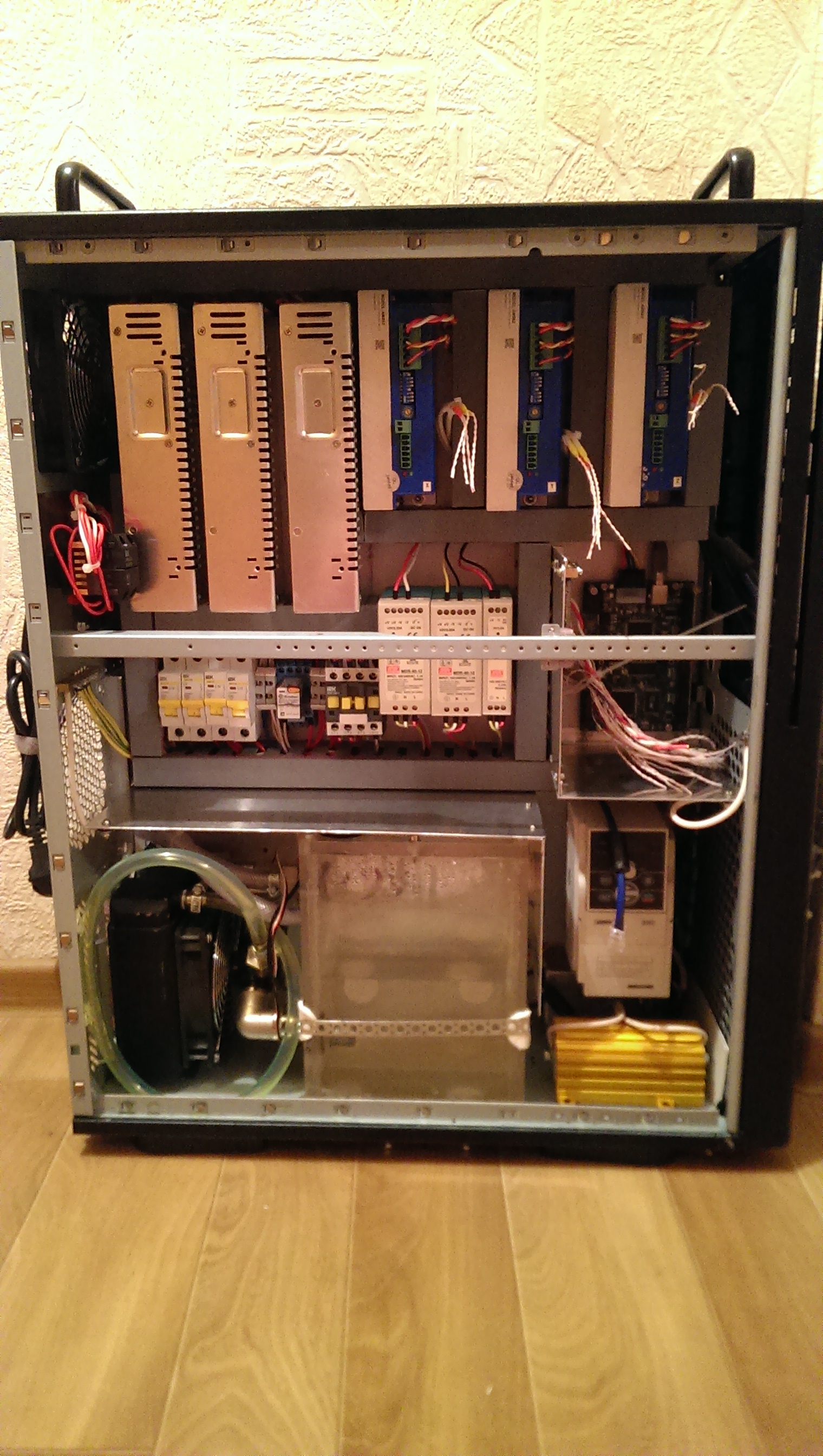 Шкаф управления малость переделал, выглядит так (при тестировании частотник выключен, работают БП драйверов и 2 БП К-ФЛОПА). Получилось конечно все в притирку и это расстраивает, но буду прикручивать дополнительное принудительное охлаждение: