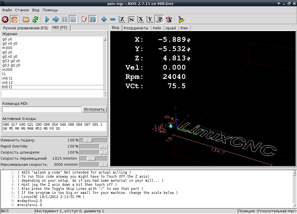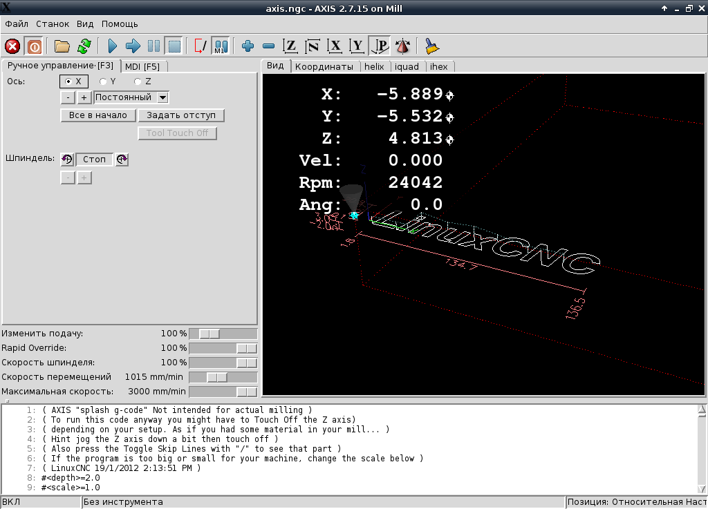 aftaev писал(а): Вот для таких экранчиков окна в axis нужно раскидать по закладкам. Gcode должен быть в одной вкладке, визуализация в другом и тд..