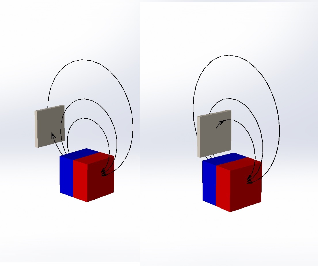 справа и слева от магнита, направление силовых линий неизменно. Магнит нужно вогруг оси повернуть, что бы направление изменилось, простым перемещением не отделаешься. Красным нужно повернуть вниз, тогда направление будет меняться при перемещении, но так обычно не делают.