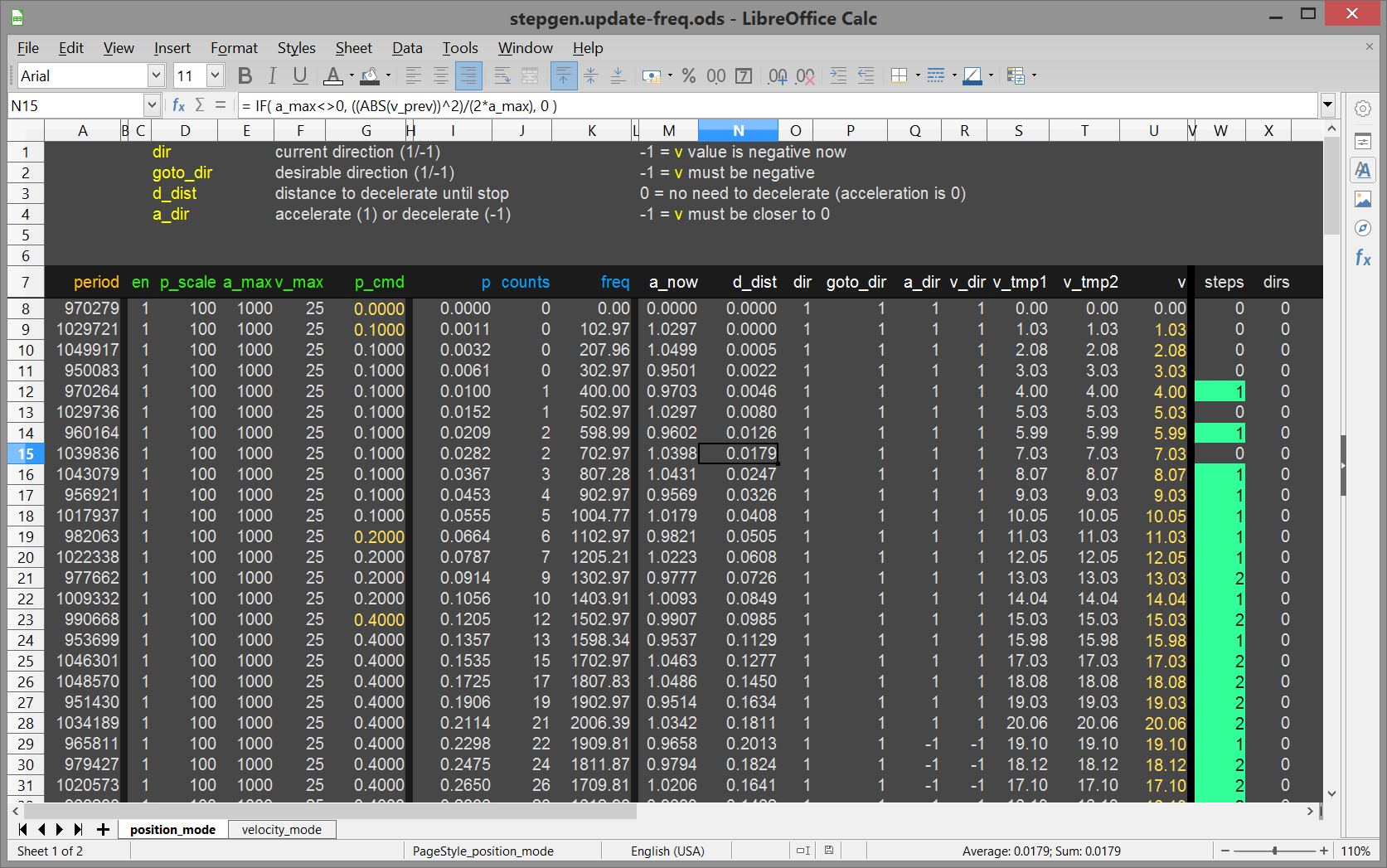 stepgen'a с симуляцией в электронных таблицах. Надо провести ещё несколько тестов, подчистить косяки и можно заливать все эти формулы в код драйвера. Больше всего времени отнял режим работы
