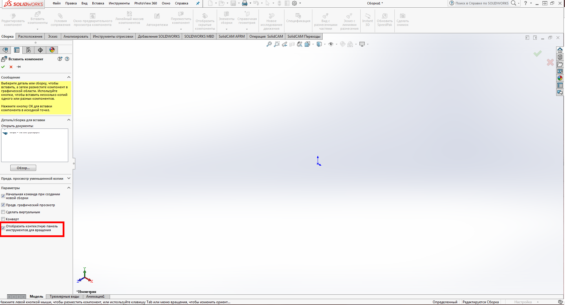 Выручайте, а то я что-то намудрил и в сборке при вставке нового компонента не отображается контекстная панель для вращения компонента.