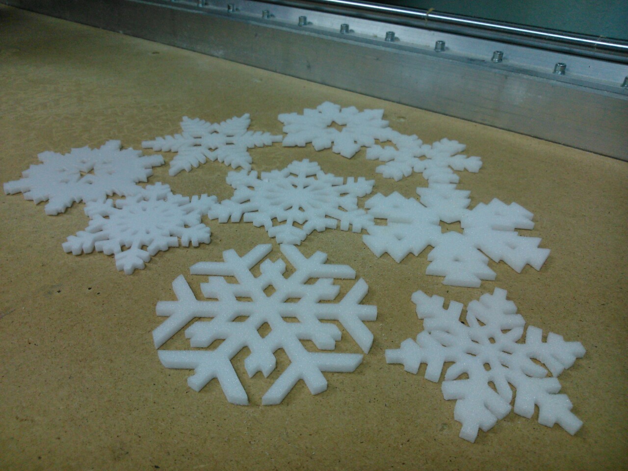При резке нервюрок ничего не гнулось, лист бальзы просто прижал с краев импровизированными прижимами саморез+увеличенная шайба, а вот со снежинками пришлось не много помучиться- при обрезке контура ,за счет потери жесткости листа заготовки фреза начала двигать последний, пришлось придавливать вручную каждую. Резал кукурузой 0,8 и 1,5 мм- заготовку не поднимает.