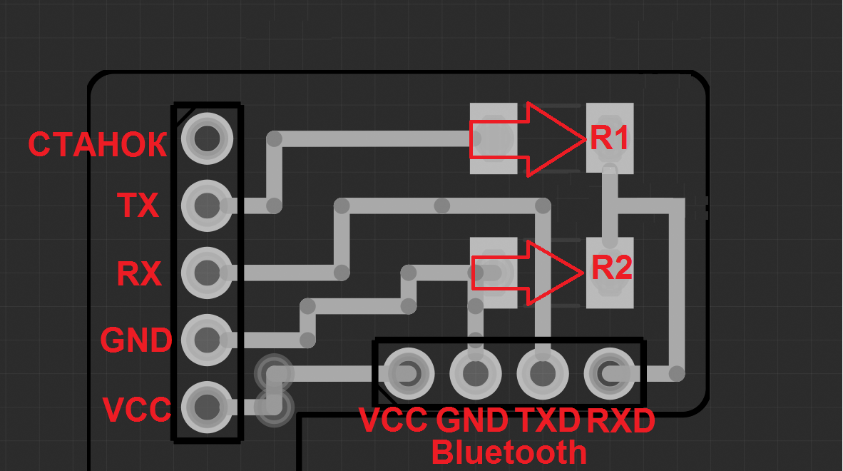 Создал плату, но напряжение на RXD (между средней точкой резисторов) не 3,3 вольта а 5. Резисторы 2,4K и 1,2k Oм. Меряю тестером без подключенной платы Blueetooth. Такая проблема на двух платах.