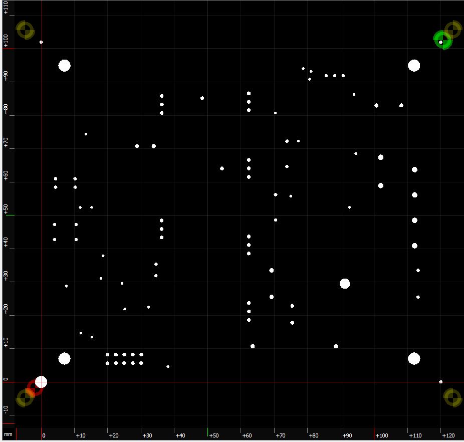 Видны кремежные отверстия 3,5мм, а еще дальше по углам реперы 0,8. Нижний левый репер - в нулевой координате.