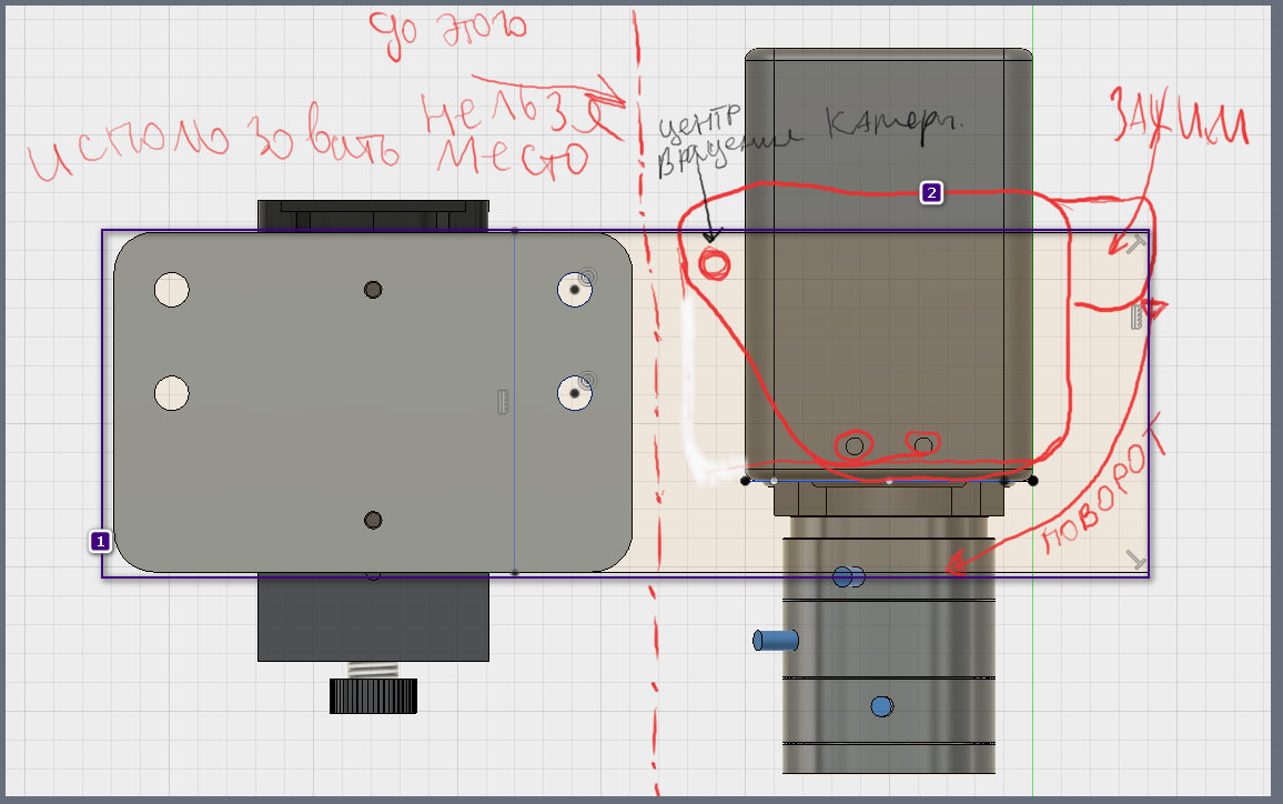 Всё пытаюсь придумать как сделать подвижное крепление камеры №2 на неподвижном креплении №1, где закреплен лазер, материал оргстекло 3мм (другого материала нормального нету, но могу делать пирог из нескольких), и не могу придумать конструкцию фиксатора камеры, может кто знает, как тут можно его реализовать? :thinking: