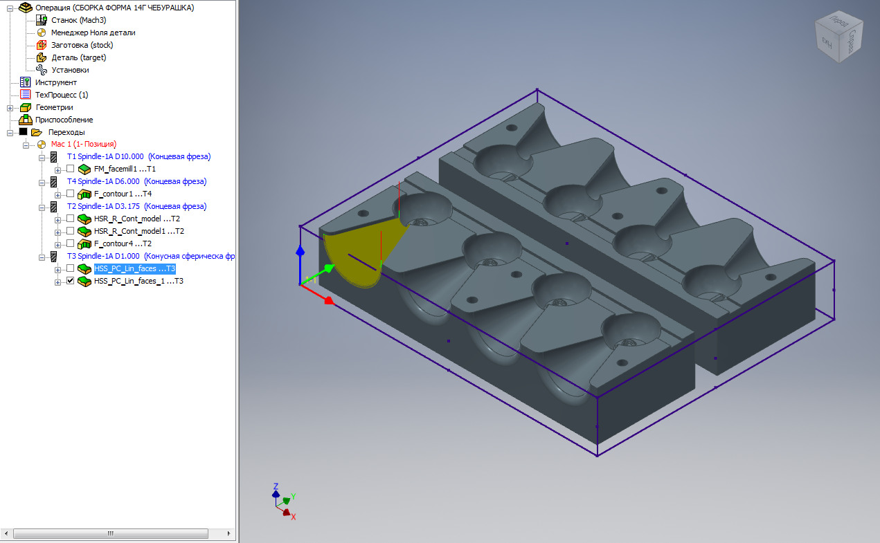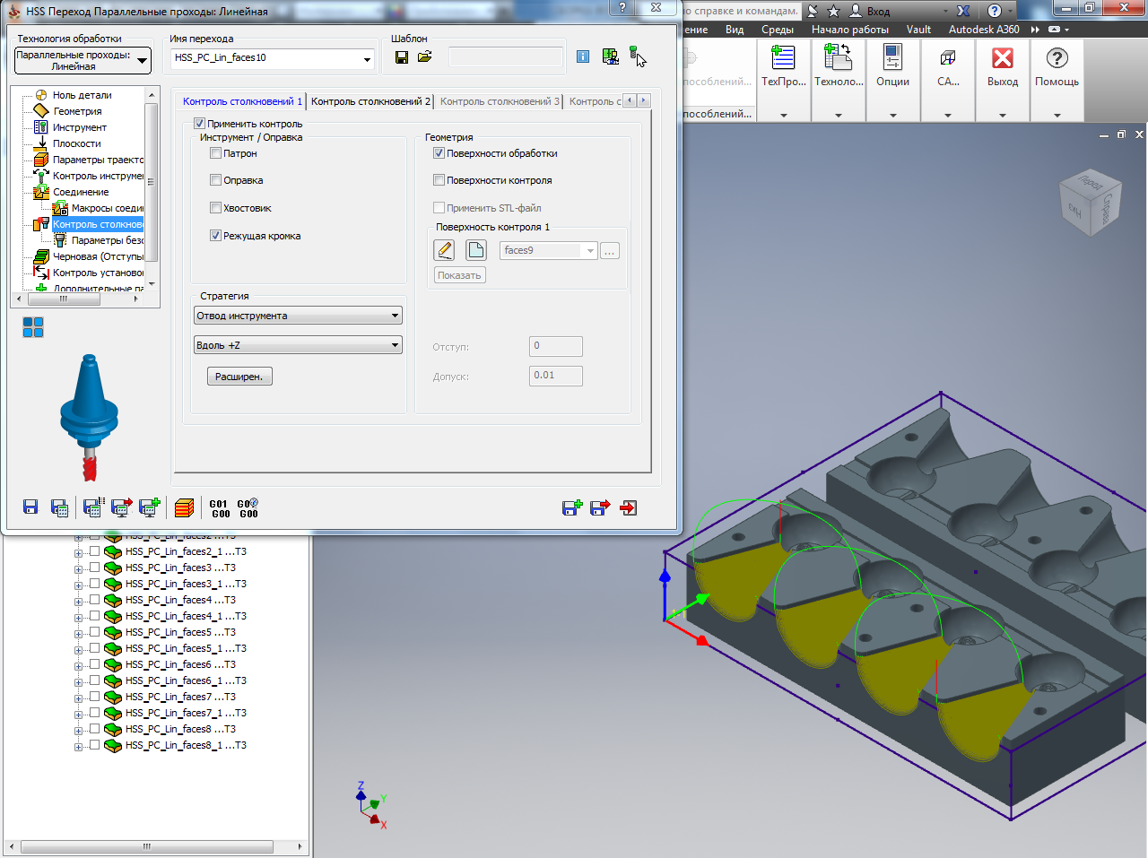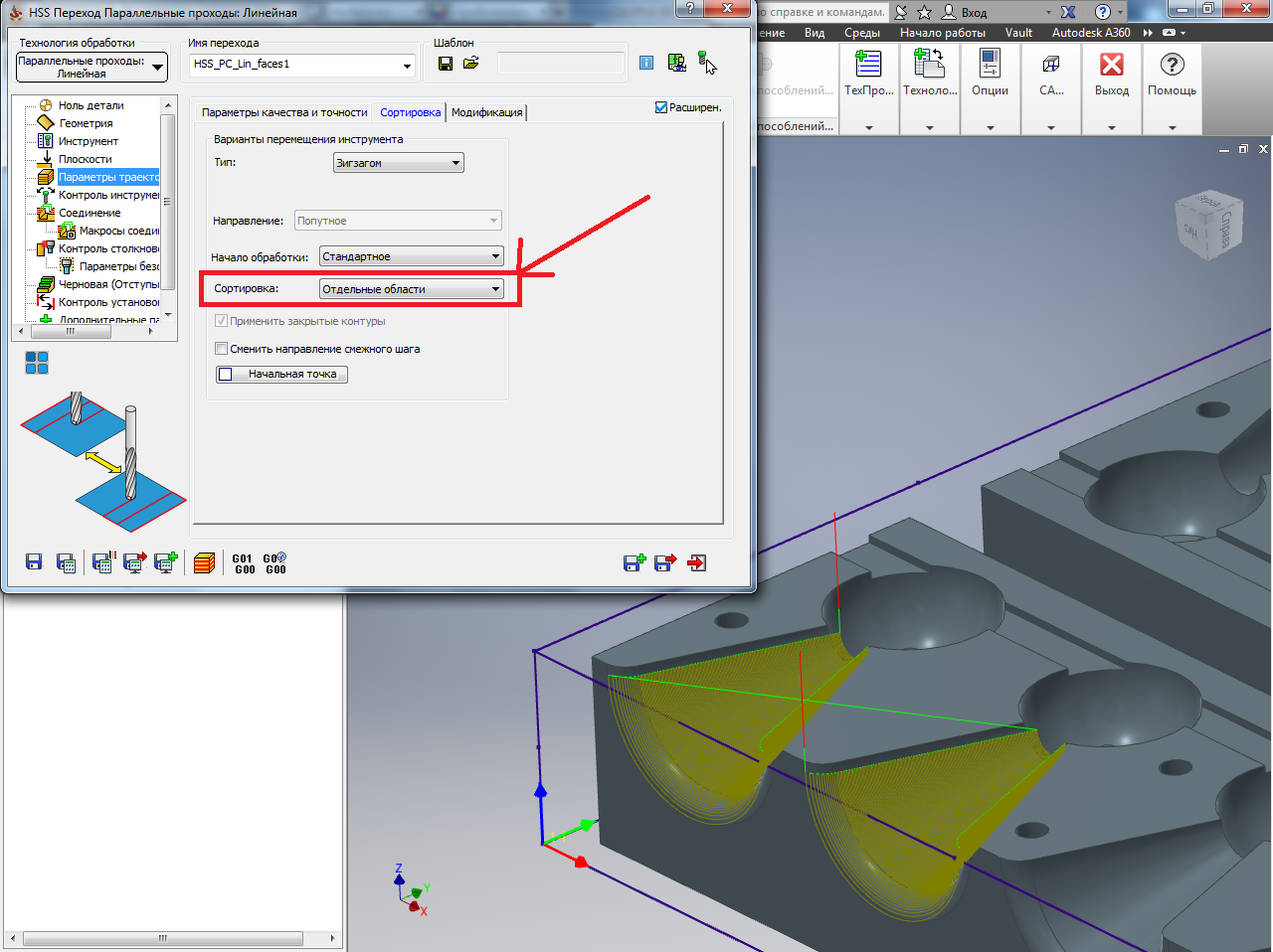 Смотрим, есть деталь с множеством однотипных операций, а именно, HSS параллельные проходы, линейная. Выбираю поверхность обработки (а точнее две поверхности, сам желоб и скругление), настраиваю как мне надо (инструмент, смежный шаг, продлить начало обработки на 80%, и меняю соединения траектории на "прямое", чтобы инструмент был всегда на поверхности обработки и не поднимался на безопасную высоту). Тут всё устраивает. Однако, если я выбираю две и более однотипные поверхности, то инструмент начинает бегать от одной поверхности к другой. Если установить галочку Сортировка -> Отдельные области, то инструмент сделав первую поверхность по прямой переходит ко второй. Оно то и правильно, я ведь ранее указывал чтобы инструмент обрабатывал поверхность непрерывно, без поднятия. Но это почему то распространяется на переход от одной поверхности к другой. Меняю соединение траектории, инструмент теперь переезжает как надо, но вот поднятие его в ненужных местах огорчает Пробовал и на разных моделях, то есть в сборке у меня две CAD модели и выбираю я поверхности на разных моделях - инструмент не понимает что надо перед переходом к другой модели подняться на безопасную. Это глюк программы, моя криворукость или неправильно выбранная стратегия?