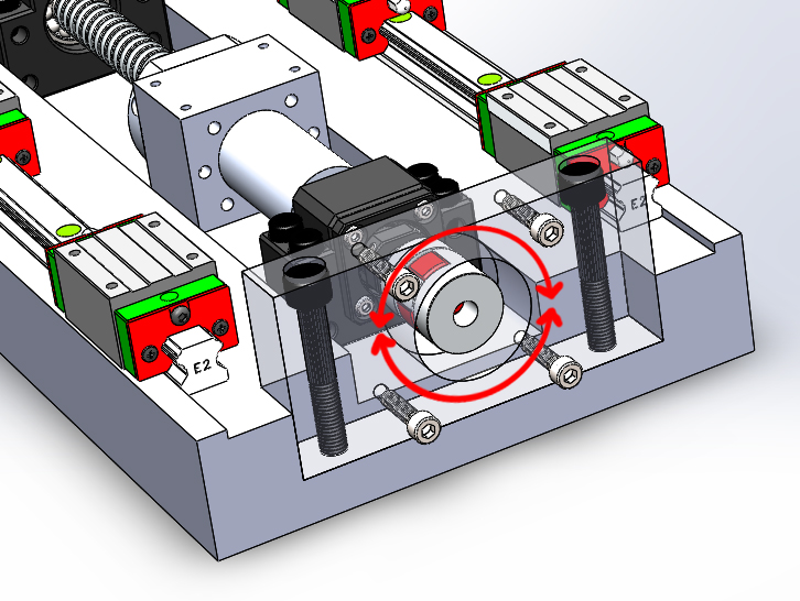 В твоём варианте вижу небольшую возможность регулировки соосности вала ШД и ШВП за счет зазоров между болтом и отверстием, в моём случае остаётся только надеяться на точность изготовления деталек. Но не будет ли в твоём случае проворачивать кронштейн при нагрузках? Если я правильно понимаю, то момент будет не параллельна винту ШВП, а так сказать концентрично ( как на картинке нарисовано стрелками). Что думаешь?